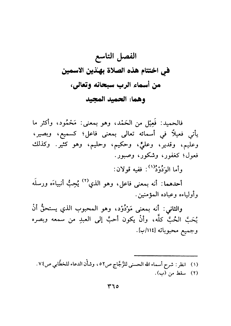الفصل التاسع في اختتام هذه الصلاة بهذين الاسمين من أسماء الرب سبحانه وتعالى، وهما: الحميد المجيد