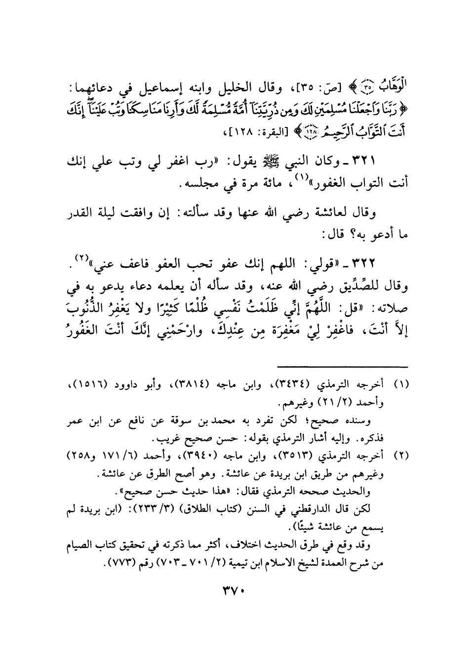 ٣٢٢ - "قولي: اللهم إنك عفو تحب العفو فاعف عني" (¬٢). وقال للصِّدِّيق رضي الله عنه، وقد سأله أن يعلمه دعاء يدعو به في صلاته: "قل: اللَّهُمَّ إنِّي ظَلَمْتُ نَفْسِي ظُلْمًا كَثيْرًا ولا يَغْفِرُ الذُّنُوبَ إلَّا أنْتَ، فاغْفِرْ لِيْ مَغْفِرَة مِن عِنْدِكَ، وارْحَمْنِي إنَّكَ أنْتَ الغَفُورُ
