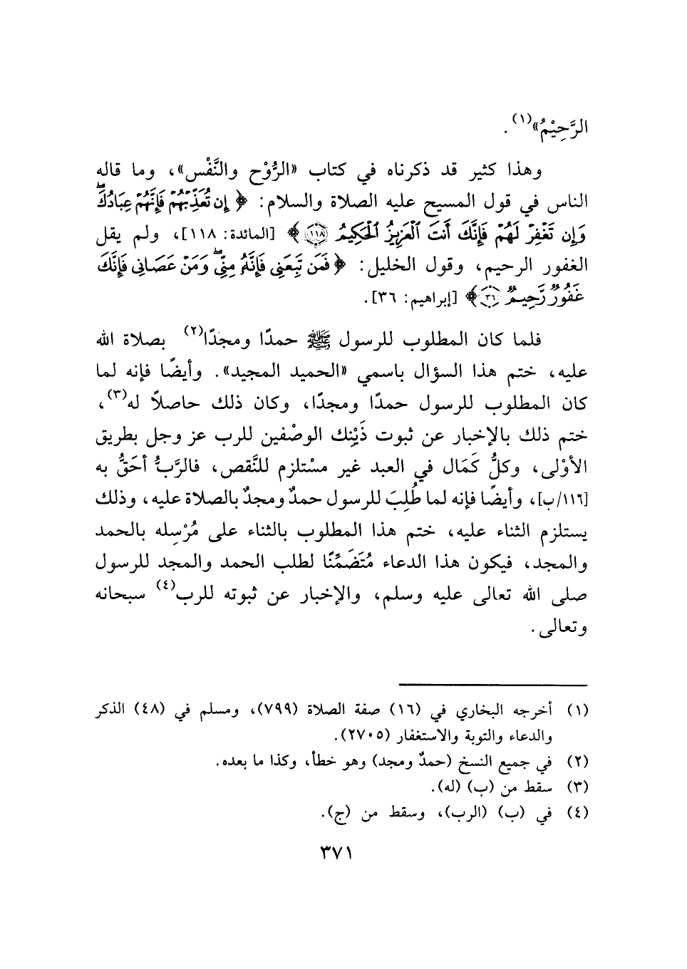 وهذا كثير قد ذكرناه في كتاب "الرُّوْح والنَّفْس"، وما قاله الناس في قول المسيح عليه الصلاة والسلام: {إِنْ تُعَذِّبْهُمْ فَإِنَّهُمْ عِبَادُكَ وَإِنْ تَغْفِرْ لَهُمْ فَإِنَّكَ أَنْتَ الْعَزِيزُ الْحَكِيمُ (١١٨)} [المائدة: ١١٨]، ولم يقل الغفور الرحيم، وقول الخليل: {فَمَنْ تَبِعَنِي فَإِنَّهُ مِنِّي وَمَنْ عَصَانِي فَإِنَّكَ غَفُورٌ رَحِيمٌ (٣٦)} [إبراهيم: ٣٦].