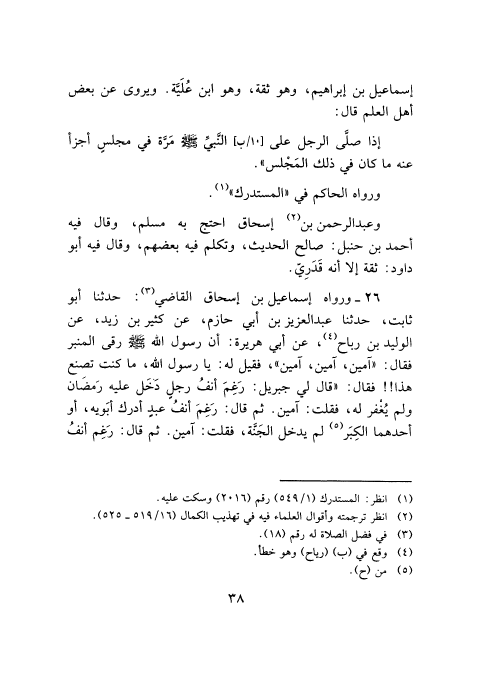 ٢٦ - ورواه إسماعيل بن إسحاق القاضي (¬٣): حدثنا أبو ثابت، حدثنا عبد العزيز بن أبي حازم، عن كثير بن زيد، عن الوليد بن رباح (¬٤)، عن أبي هريرة: أن رسول الله - صلى الله عليه وسلم - رقى المنبر فقال: "آمين، آمين، آمين"، فقيل له: يا رسول الله، ما كنت تصنع هذا!! فقال: "قال لي جبريل: رَغِمَ أنفُ رجلٍ دَخل عليه رَمضَان ولم يُغفر له، فقلت: آمين. ثم قال: رَغِمَ أنفُ عبدٍ أدرك أبَويه، أو أحدهما الكِبَر (¬٥) لم يدخل الجَنَّة، فقلت: آمين. ثم قال: رَغِم أنفُ