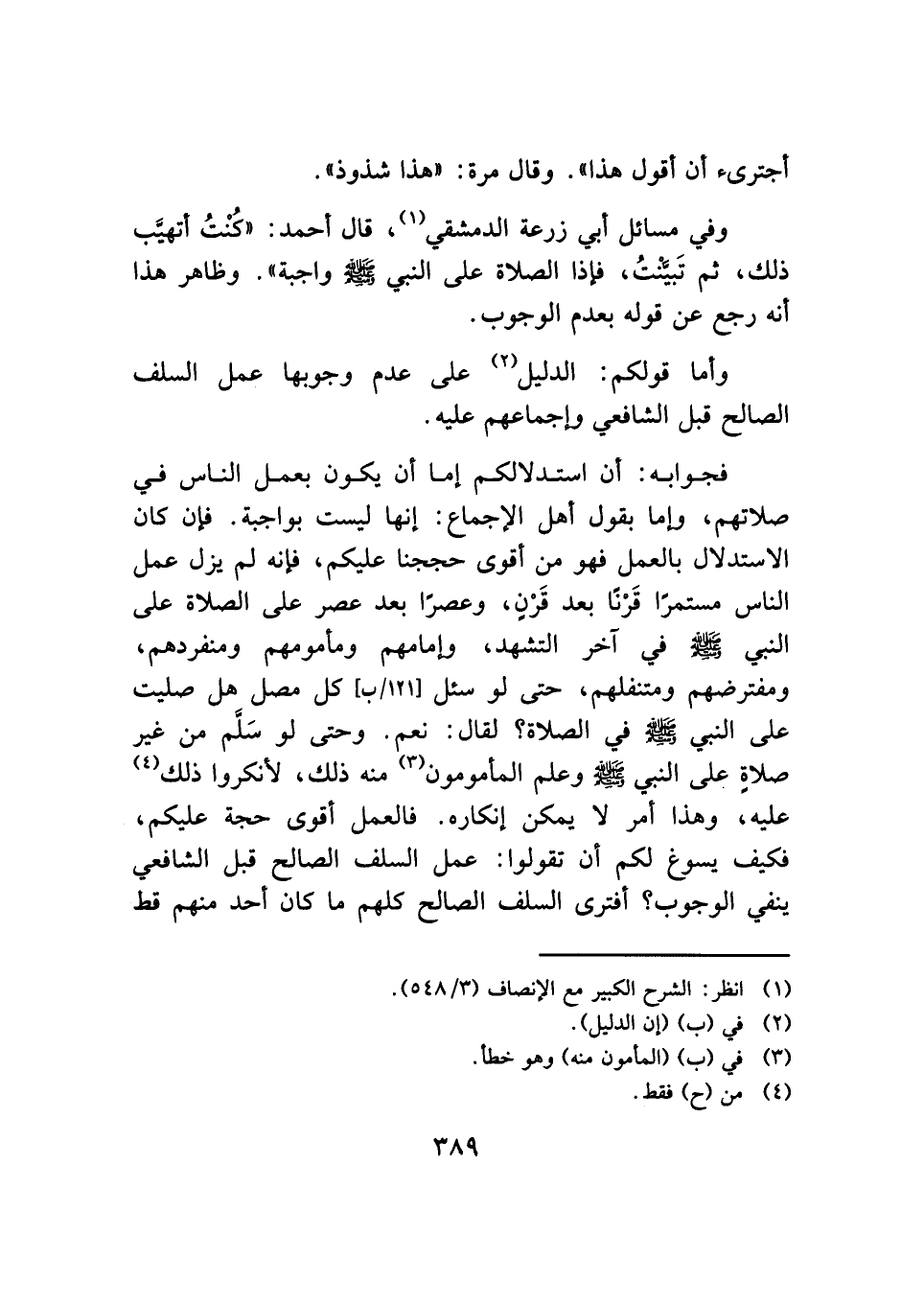 وفي مسائل أبي زرعة الدمشقي (¬١)، قال أحمد: "كُنْتُ أتهيَّب ذلك، ثم تَبيَّنْتُ، فإذا الصلاة على النبي - صلى الله عليه وسلم - واجبة". وظاهر هذا أنه رجع عن قوله بعدم الوجوب.