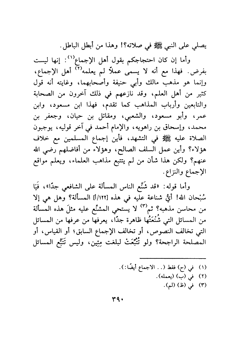 وأما إن كان احتجاجكم بقول أهل الإجماع (¬١): إنها ليست بفرض. فهذا مع أنه لا يسمى عملًا لم يعلمه (¬٢) أهل الإجماع، وإنما هو مذهب مالك وأبي حنيفة وأصحابهما، وغايته أنه قول كثير من أهل العلم، وقد نازعهم في ذلك آخرون من الصحابة والتابعين وأرباب المذاهب كما تقدم، فهذا ابن مسعود، وابن عمر، وأبو مسعود، والشعبي، ومقاتل بن حيان، وجعفر بن محمد، وإسحاق بن راهويه، والإمام أحمد في آخر قوليه، يوجبون الصلاة عليه - صلى الله عليه وسلم - في التشهد، فأين إجماع المسلمين مع خلاف هؤلاء؟ وأين عمل السلف الصالح، وهؤلاء من أفاضلهم رضي الله عنهم؟ ولكن هذا شأن من لم يتتبع مذاهب العلماء، ويعلم مواقع الإجماع والنزاع.