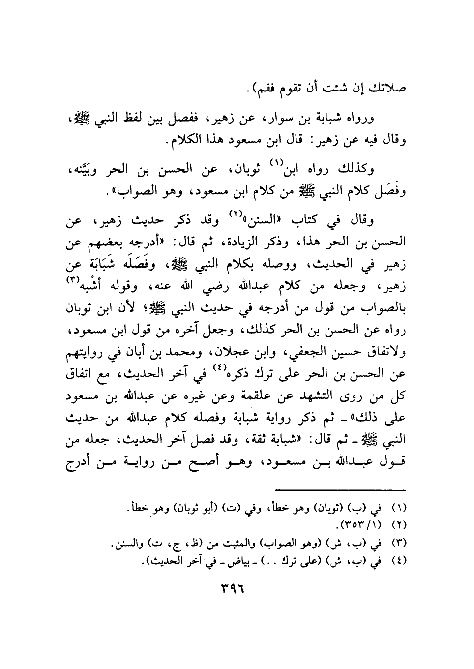 وقال في كتاب "السنن" (¬٢) وقد ذكر حديث زهير، عن الحسن بن الحر هذا، وذكر الزيادة، ثم قال: "أدرجه بعضهم عن زهير في الحديث، ووصله بكلام النبي - صلى الله عليه وسلم -، وفَصَلَه شَبَابَة عن زهير، وجعله من كلام عبد الله رضي الله عنه، وقوله أشْبه (¬٣) بالصواب من قول من أدرجه في حديث النبي - صلى الله عليه وسلم -؛ لأن ابن ثوبان رواه عن الحسن بن الحر كذلك، وجعل آخره من قول ابن مسعود، ولاتفاق حسين الجعفي، وابن عجلان، ومحمد بن أبان في روايتهم عن الحسن بن الحر على ترك ذكره (¬٤) في آخر الحديث، مع اتفاق كل من روى التشهد عن علقمة وعن غيره عن عبد الله بن مسعود على ذلك" - ثم ذكر رواية شبابة وفصله كلام عبد الله من حديث النبي - صلى الله عليه وسلم - ثم قال: "شبابة ثقة، وقد فصل آخر الحديث، جعله من قول عبد الله بن مسعود، وهو أصح من رواية من أدرج