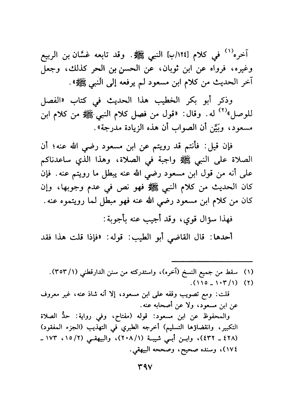 فإن قيل: فأنتم قد رويتم عن ابن مسعود رضي الله عنه؛ أن الصلاة على النبي - صلى الله عليه وسلم - واجبة في الصلاة، وهذا الذي ساعدناكم على أنه من قول ابن مسعود رضي الله عنه يبطل ما رويتم عنه. فإن كان الحديث من كلام النبي - صلى الله عليه وسلم - فهو نص في عدم وجوبها، وإن كان من كلام ابن مسعود رضى الله عنه فهو مبطل لما رويتموه عنه.
