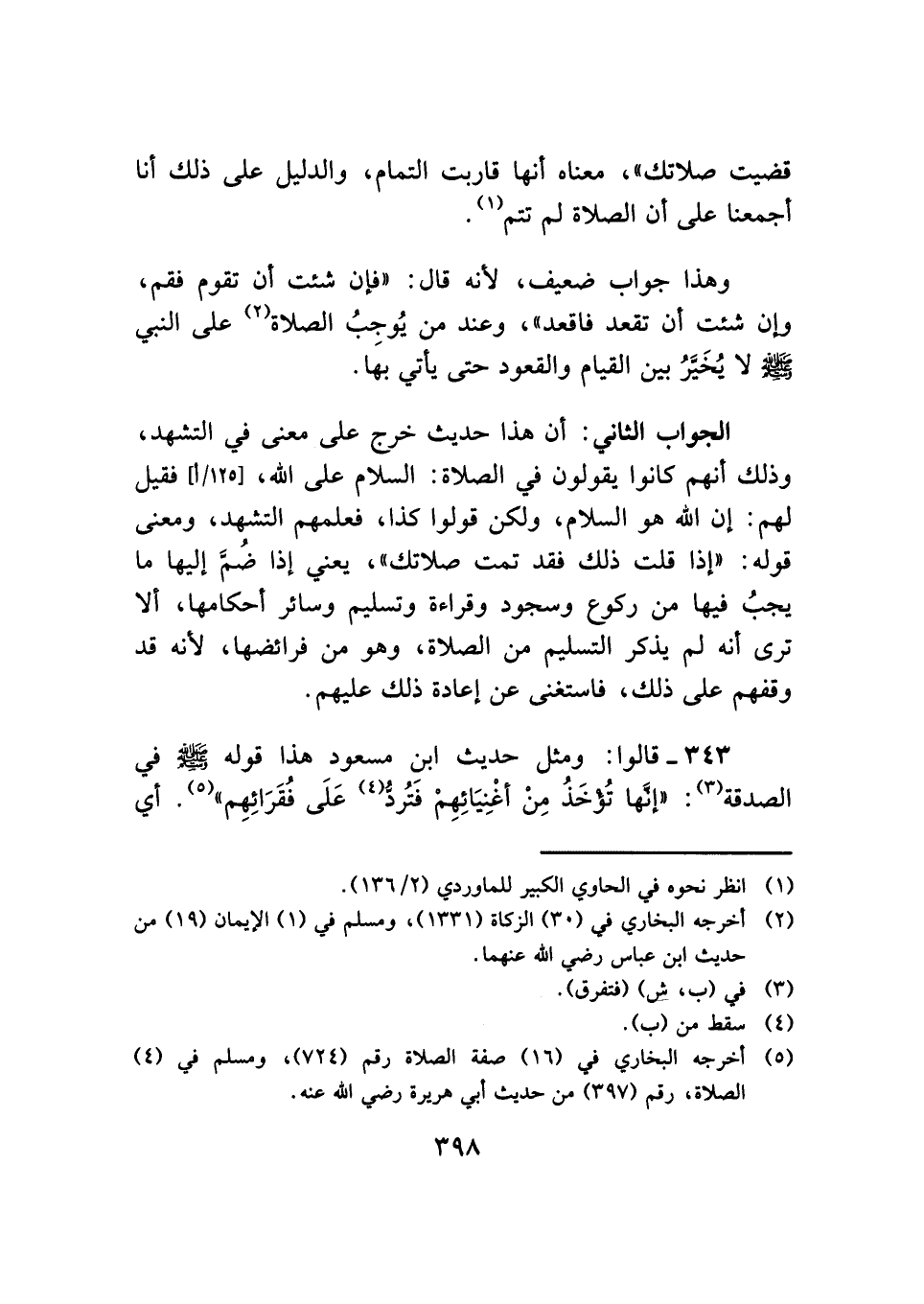 ٣٤٣ - قالوا: ومثل حديث ابن مسعود هذا قوله - صلى الله عليه وسلم - في الصدقة (¬٣): "إنَّها تُؤْخَذُ مِنْ أغْنِيَائِهِمْ فَتُردُّ (¬٤) عَلَى فُقَرَائِهِم" (¬٥). أي