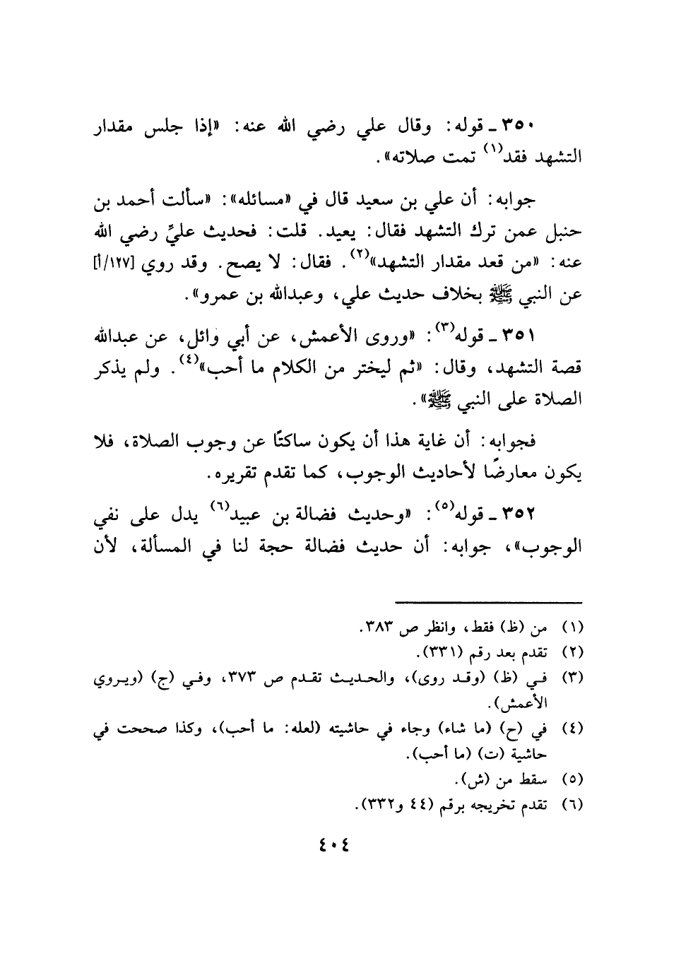 ٣٥١ - قوله (¬٣): "وروى الأعمش، عن أبي وائل، عن عبد الله قصة التشهد، وقال: "ثم ليختر من الكلام ما أحب" (¬٤). ولم يذكر الصلاة على النبي - صلى الله عليه وسلم -".