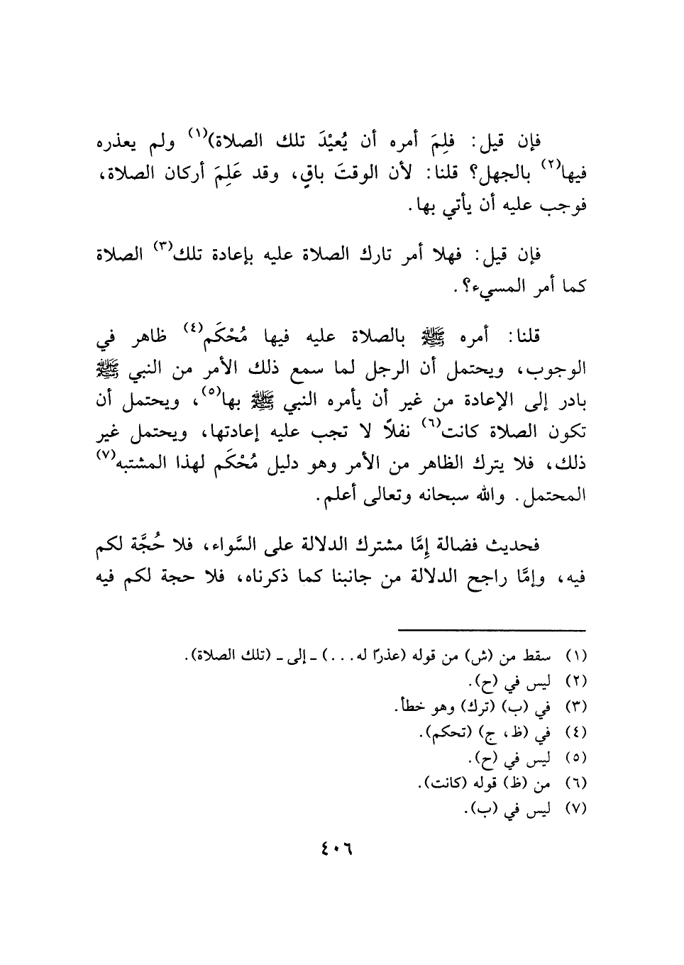 قلنا: أمره - صلى الله عليه وسلم - بالصلاة عليه فيها مُحْكَم (¬٤) ظاهر في الوجوب، ويحتمل أن الرجل لما سمع ذلك الأمر من النبي - صلى الله عليه وسلم - بادر إلى الإعادة من غير أن يأمره النبي - صلى الله عليه وسلم - بها (¬٥)، ويحتمل أن تكون الصلاة كانت (¬٦) نفلًا لا تجب عليه إعادتها، ويحتمل غير ذلك، فلا يترك الظاهر من الأمر وهو دليل مُحْكَم لهذا المشتبه (¬٧) المحتمل. والله سبحانه وتعالى أعلم.