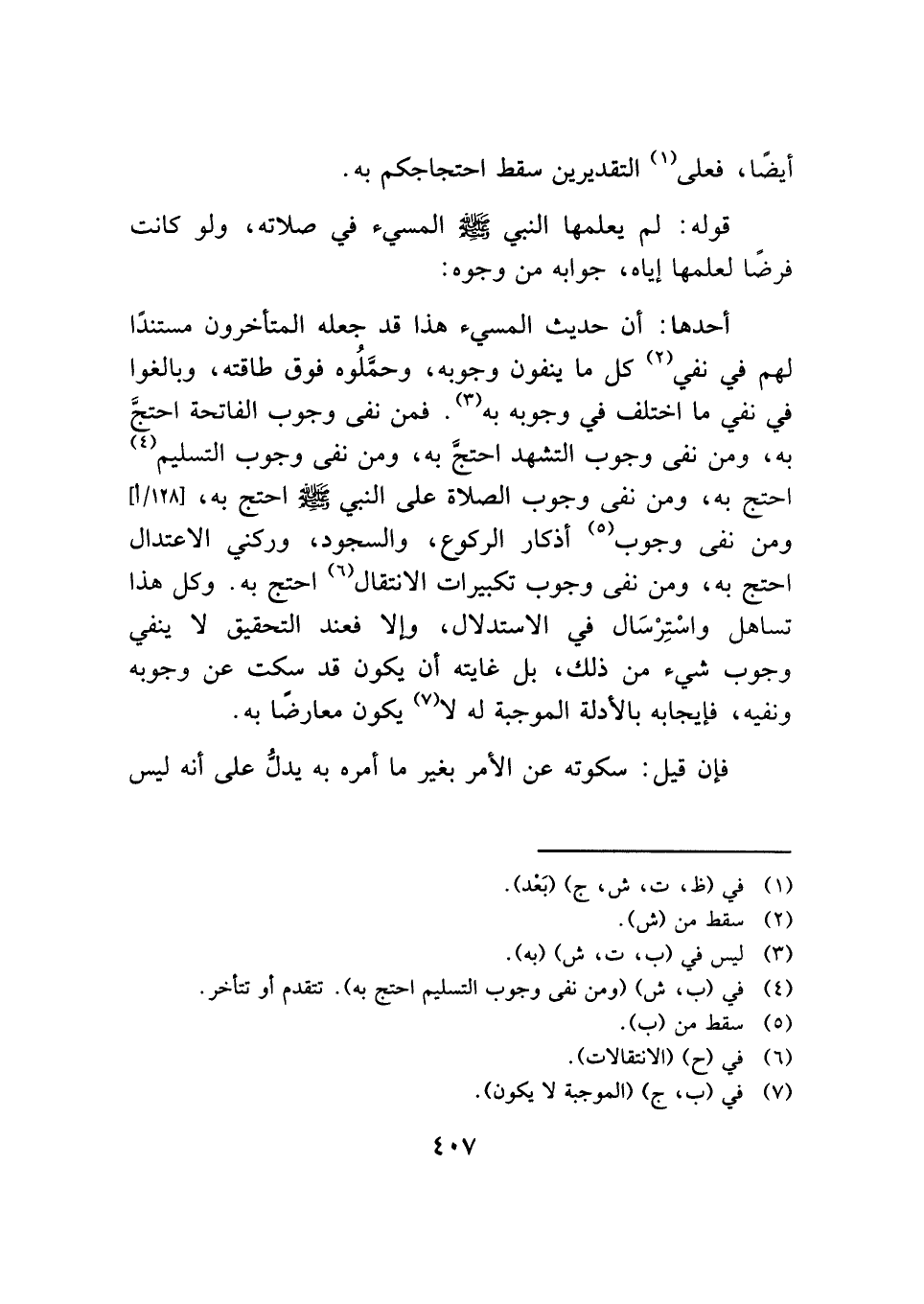 أحدها: أن حديث المسيء هذا قد جعله المتأخرون مستندًا لهم في نفي (¬٢) كل ما ينفون وجوبه، وحمَّلُوه فوق طاقته، وبالغوا في نفي ما اختلف في وجوبه به (¬٣). فمن نفى وجوب الفاتحة احتجَّ به، ومن نفى وجوب التشهد احتجَّ به، ومن نفى وجوب التسليم (¬٤) احتج به، ومن نفى وجوب الصلاة على النبي - صلى الله عليه وسلم - احتج به، ومن نفى وجوب (¬٥) أذكار الركوع، والسجود، وركني الاعتدال احتج به، ومن نفى وجوب تكبيرات الانتقال (¬٦) احتج به. وكل هذا تساهل واسْتِرْسَال في الاستدلال، وإلا فعند التحقيق لا ينفي وجوب شيء من ذلك، بل غايته أن يكون قد سكت عن وجوبه ونفيه، فإيجابه بالأدلة الموجبة له لا (¬٧) يكون معارضًا به.