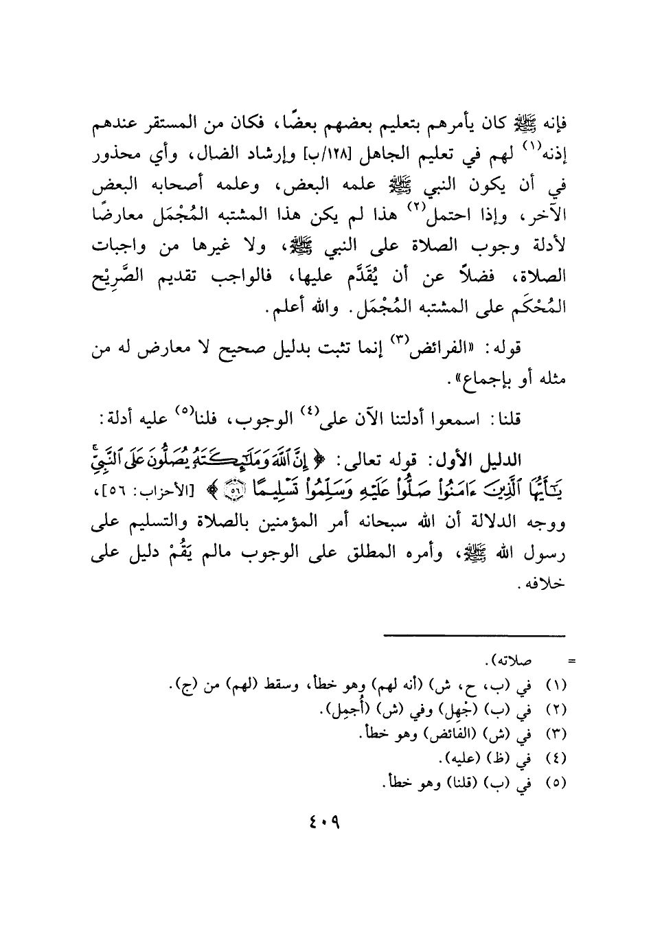 فإنه - صلى الله عليه وسلم - كان يأمرهم بتعليم بعضهم بعضًا، فكان من المستقر عندهم إذنه (¬١) لهم في تعليم الجاهل وإرشاد الضال، وأي محذور في أن يكون النبي - صلى الله عليه وسلم - علمه البعض، وعلمه أصحابه البعض الآخر، وإذا احتمل (¬٢) هذا لم يكن هذا المشتبه المُجْمَل معارضًا لأدلة وجوب الصلاة على النبي - صلى الله عليه وسلم -، ولا غيرها من واجبات الصلاة، فضلًا عن أن يُقَدَّم عليها، فالواجب تقديم الصَّرِيْح المُحْكَم على المشتبه المُجْمَل. والله أعلم.
