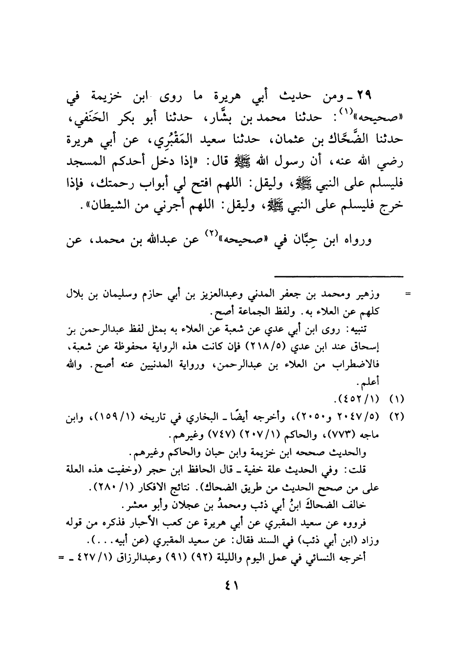 ٢٩ - ومن حديث أبي هريرة ما روى ابن خزيمة في "صحيحه" (¬١): حدثنا محمد بن بشَّار، حدثنا أبو بكر الحَنَفي، حدثنا الضَّحَّاك بن عثمان، حدثنا سعيد المَقْبُرِي، عن أبي هريرة رضي الله عنه، أن رسول الله - صلى الله عليه وسلم - قال: "إذا دخل أحدكم المسجد فليسلم على النبي - صلى الله عليه وسلم -، وليقل: اللهم افتح لي أبواب رحمتك، فإذا خرج فليسلم على النبي - صلى الله عليه وسلم -، وليقل: اللهم أجرني من الشيطان".