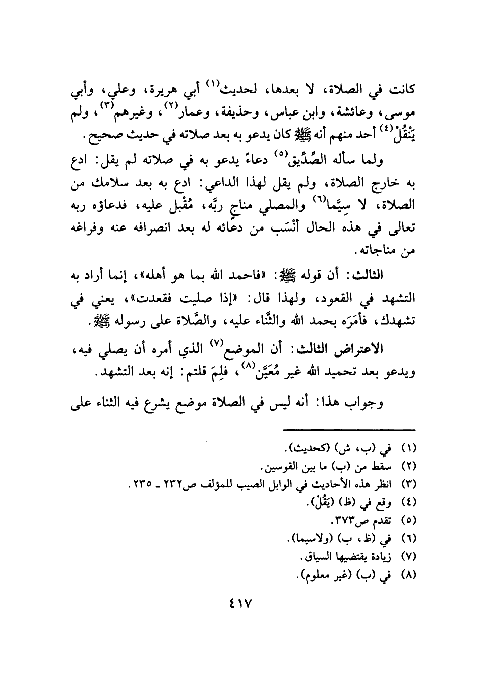 الاعتراض الثالث: أن الموضع (¬٧) الذي أمره أن يصلي فيه، ويدعو بعد تحميد الله غير مُعَيَّن (¬٨)، فلِمَ قلتم: إنه بعد التشهد.