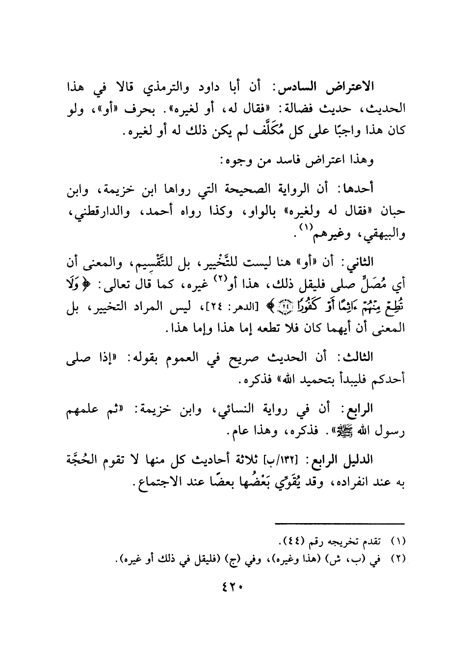 الثاني: أن "أو" هنا ليست للتَّخْيير، بل للتَّقْسِيم، والمعنى أن أي مُصلٍّ صلى فليقل ذلك، هذا أو (¬٢) غيره، كما قال تعالى: {وَلَا تُطِعْ مِنْهُمْ آثِمًا أَوْ كَفُورًا (٢٤)} [الدهر: ٢٤]، ليس المراد التخيير، بل المعنى أن أيهما كان فلا تطعه إما هذا وإما هذا.