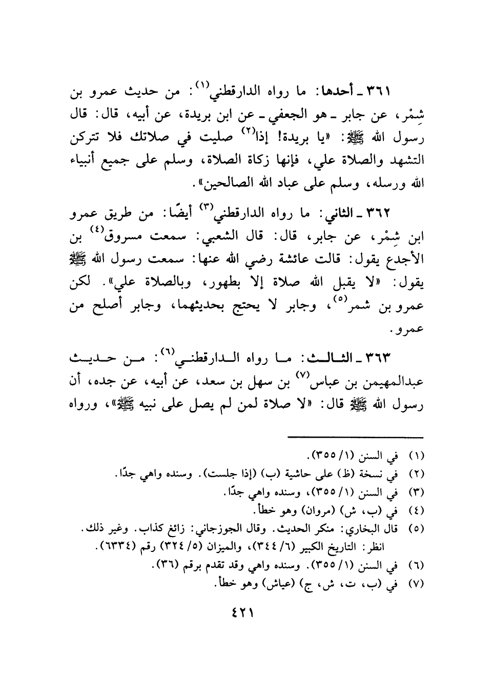 ٣٦١ - أحدها: ما رواه الدارقطني (¬١): من حديث عمرو بن شِمْر، عن جابر -هو الجعفي- عن ابن بريدة، عن أبيه، قال: قال رسول الله - صلى الله عليه وسلم -: "يا بريدة! إذا (¬٢) صليت في صلاتك فلا تتركن التشهد والصلاة علي، فإنها زكاة الصلاة، وسلم على جميع أنبياء الله ورسله، وسلم على عباد الله الصالحين".