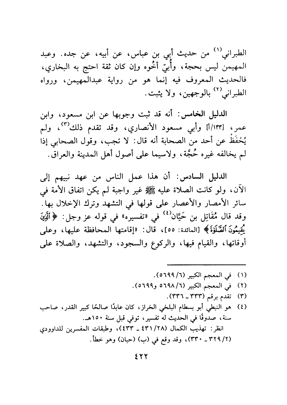 الدليل السادس: أن هذا عمل الناس من عهد نبيهم إلى الآن، ولو كانت الصلاة عليه - صلى الله عليه وسلم - غير واجبة لم يكن اتفاق الأمة في سائر الأمصار والأعصار على قولها في التشهد وترك الإخلال بها. وقد قال مُقَاتِل بن حَيَّان (¬٤) في "تفسيره" في قوله عز وجل: {الَّذِينَ يُقِيمُونَ الصَّلَاةَ} [المائدة: ٥٥]، قال: "إقامتها المحافظة عليها، وعلى أوقاتها، والقيام فيها، والركوع والسجود، والتشهد، والصلاة على