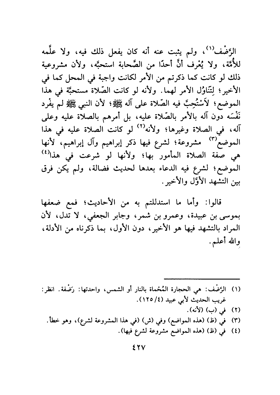 الرُّضْف (¬١)، ولم يثبت عنه أنه كان يفعل ذلك فيه، ولا علَّمه للأُمَّة، ولا يُعْرف أنَّ أحدًا من الصَّحابة استحبَّه، ولأن مشروعية ذلك لو كانت كما ذكرتم من الأمر لكانت واجبة في المحل كما في الأخير؛ لِتناوُل الأمر لهما. ولأنه لو كانت الصلاة مستحبَّة في هذا الموضع؛ لَاسْتُحِبَّ فيه الصّلاة على آله - صلى الله عليه وسلم -؛ لأن النبي - صلى الله عليه وسلم - لم يفْرد نَفْسَه دون آله بالأمر بالصّلاة عليه، بل أمرهم بالصلاة عليه وعلى آله، في الصلاة وغيرها؛ ولأنه (¬٢) لو كانت الصلاة عليه في هذا الموضع (¬٣) مشروعة؛ لشرع فيها ذكر إبراهيم وآل إبراهيم، لأنها هي صفة الصلاة المأمور بها؛ ولأنها لو شرعت في هذا (¬٤) الموضع؛ لشرع فيه الدعاء بعدها لحديث فضالة، ولم يكن فرق بين التشهد الأوَّل والأخير.