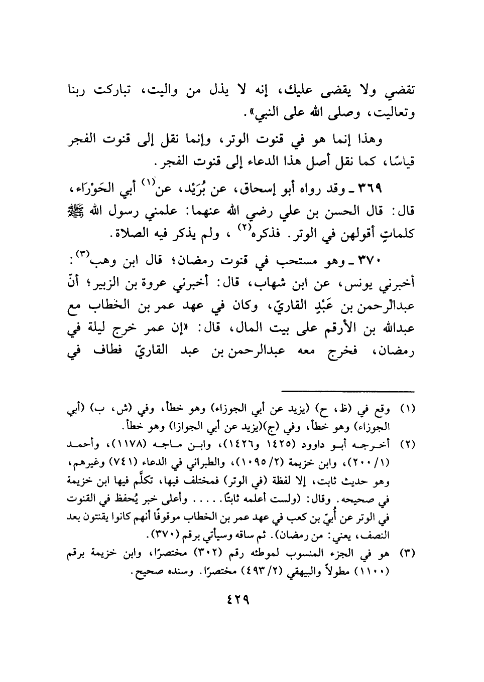 (¬٢) أخرجه أبو داوود (١٤٢٥ و ١٤٢٦)، وابن ماجه (١١٧٨)، وأحمد (١/ ٢٠٠)، وابن خزيمة (٢/ ١٠٩٥)، والطبراني في الدعاء (٧٤١) وغيرهم، وهو حديث ثابت، إلا لفظة (في الوتر) فمختلف فيها، تكلَّم فيها ابن خزيمة في صحيحه. وقال: (ولست أعلمه ثابتًا ..... وأعلى خبر يُحفظ في القنوت في الوتر عن أُبيّ بن كعب في عهد عمر بن الخطاب موقوفًا أنهم كانوا يقنتون بعد النصف، يعني: من رمضان). ثم ساقه وسيأتي برقم (٣٧٠).