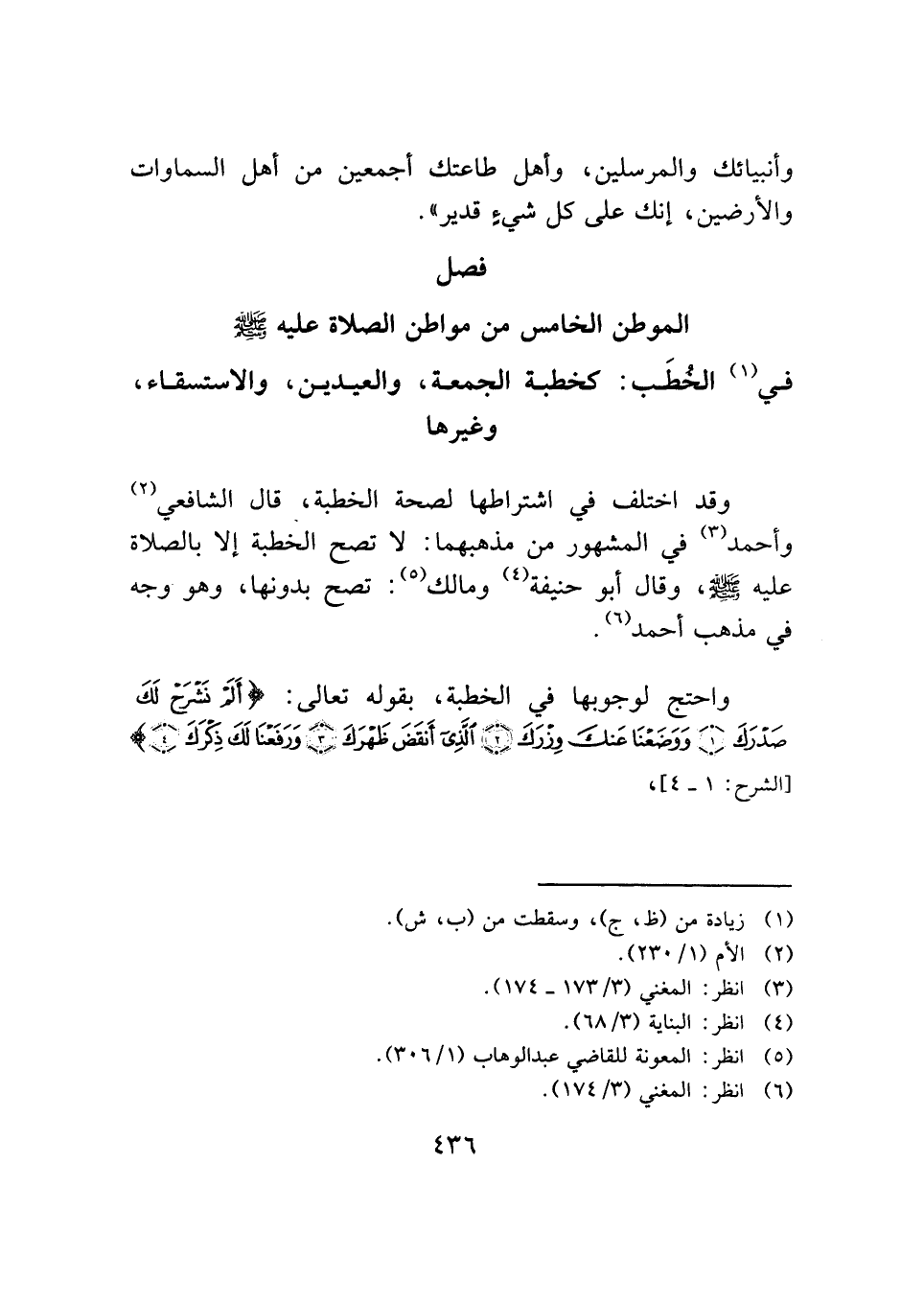 واحتج لوجوبها في الخطبة، بقوله تعالى: {أَلَمْ نَشْرَحْ لَكَ صَدْرَكَ (١) وَوَضَعْنَا عَنْكَ وِزْرَكَ (٢) الَّذِي أَنْقَضَ ظَهْرَكَ (٣) وَرَفَعْنَا لَكَ ذِكْرَكَ (٤)} [الشرح: ١ - ٤]،