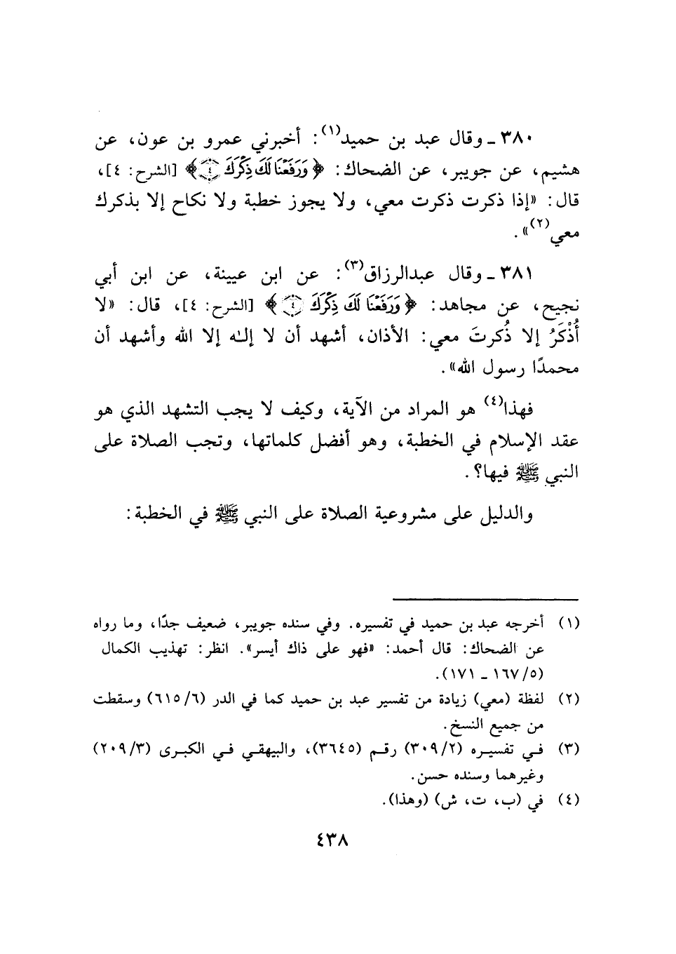 ٣٨٠ - وقال عبد بن حميد (¬١): أخبرني عمرو بن عون، عن هشيم، عن جويبر، عن الضحاك: {وَرَفَعْنَا لَكَ ذِكْرَكَ (٤)} [الشرح: ٤]، قال: "إذا ذكرت ذكرت معي، ولا يجوز خطبة ولا نكاح إلا بذكرك معي (¬٢) ".