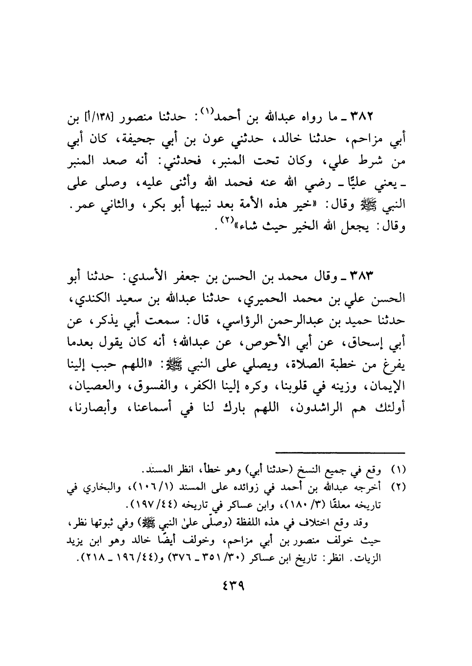 ٣٨٢ - ما رواه عبد الله بن أحمد (¬١): حدثنا منصور بن أبي مزاحم، حدثنا خالد، حدثني عون بن أبي جحيفة، كان أبي من شرط علي، وكان تحت المنبر، فحدثني: أنه صعد المنبر - يعني عليًّا - رضي الله عنه فحمد الله وأثنى عليه، وصلى على النبي - صلى الله عليه وسلم - وقال: "خير هذه الأمة بعد نبيها أبو بكر، والثاني عمر. وقال: يجعل الله الخير حيث شاء" (¬٢).