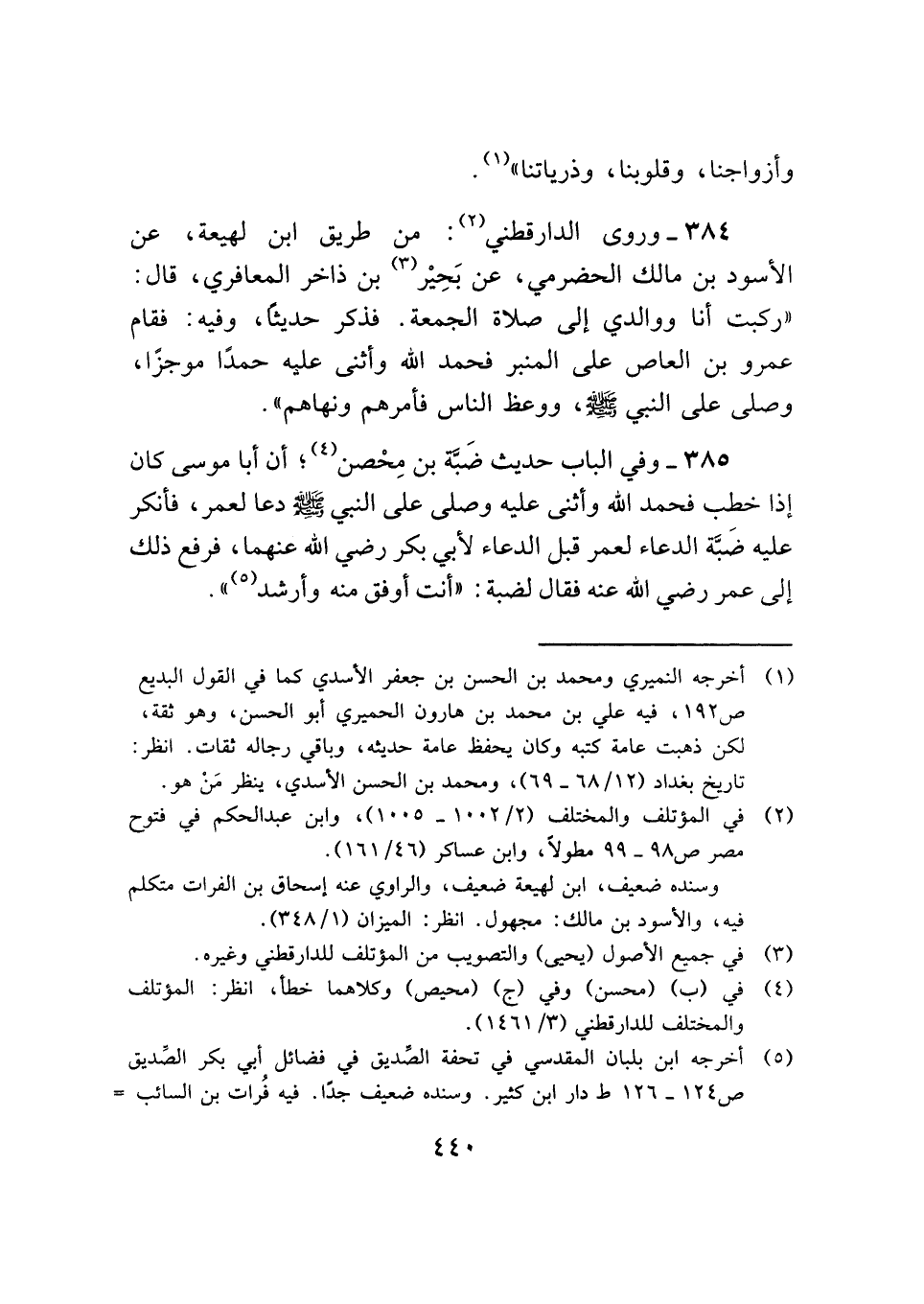٣٨٤ - وروى الدارقطني (¬٢): من طريق ابن لهيعة، عن الأسود بن مالك الحضرمي، عن بَحِيْر (¬٣) بن ذاخر المعافري، قال: "ركبت أنا ووالدي إلى صلاة الجمعة. فذكر حديثًا، وفيه: فقام عمرو بن العاص على المنبر فحمد الله وأثنى عليه حمدًا موجزًا، وصلى على النبي - صلى الله عليه وسلم -، ووعظ الناس فأمرهم ونهاهم".