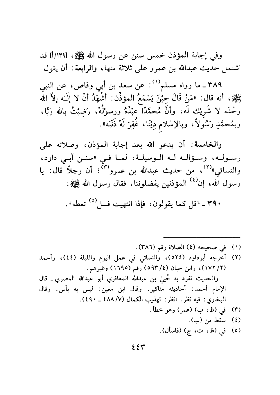 وفي إجابة المؤذن خمس سنن عن رسول الله - صلى الله عليه وسلم -، قد اشتمل حديث عبد الله بن عمرو على ثلاثة منها، والرابعة: أن يقول