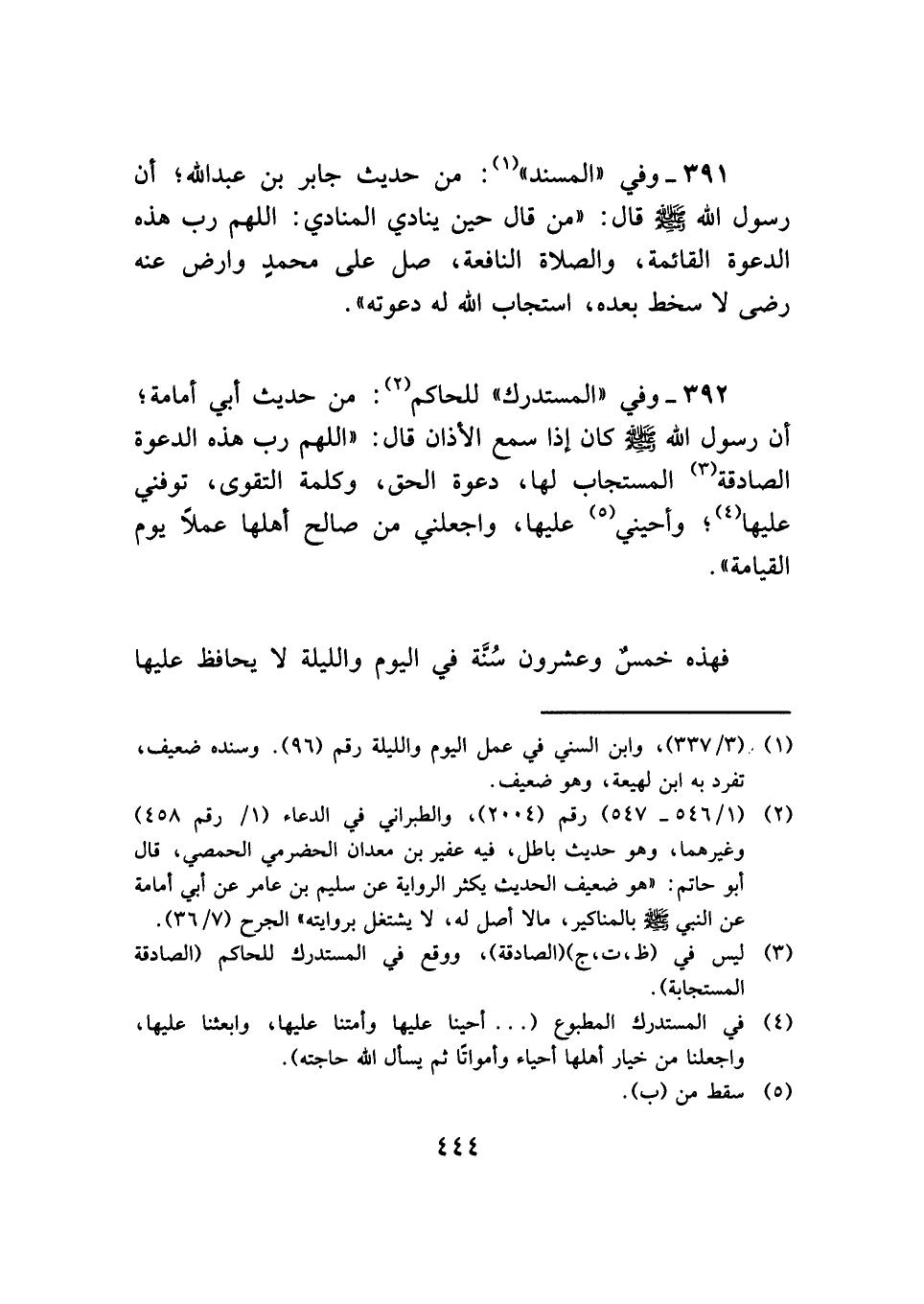 (¬٣) من المستدرك للحاكم، وسقط من (ظ، ت، ج) (الصادقة المستجابة) وسقط من بقية النسخ (الصادقة) فقط.