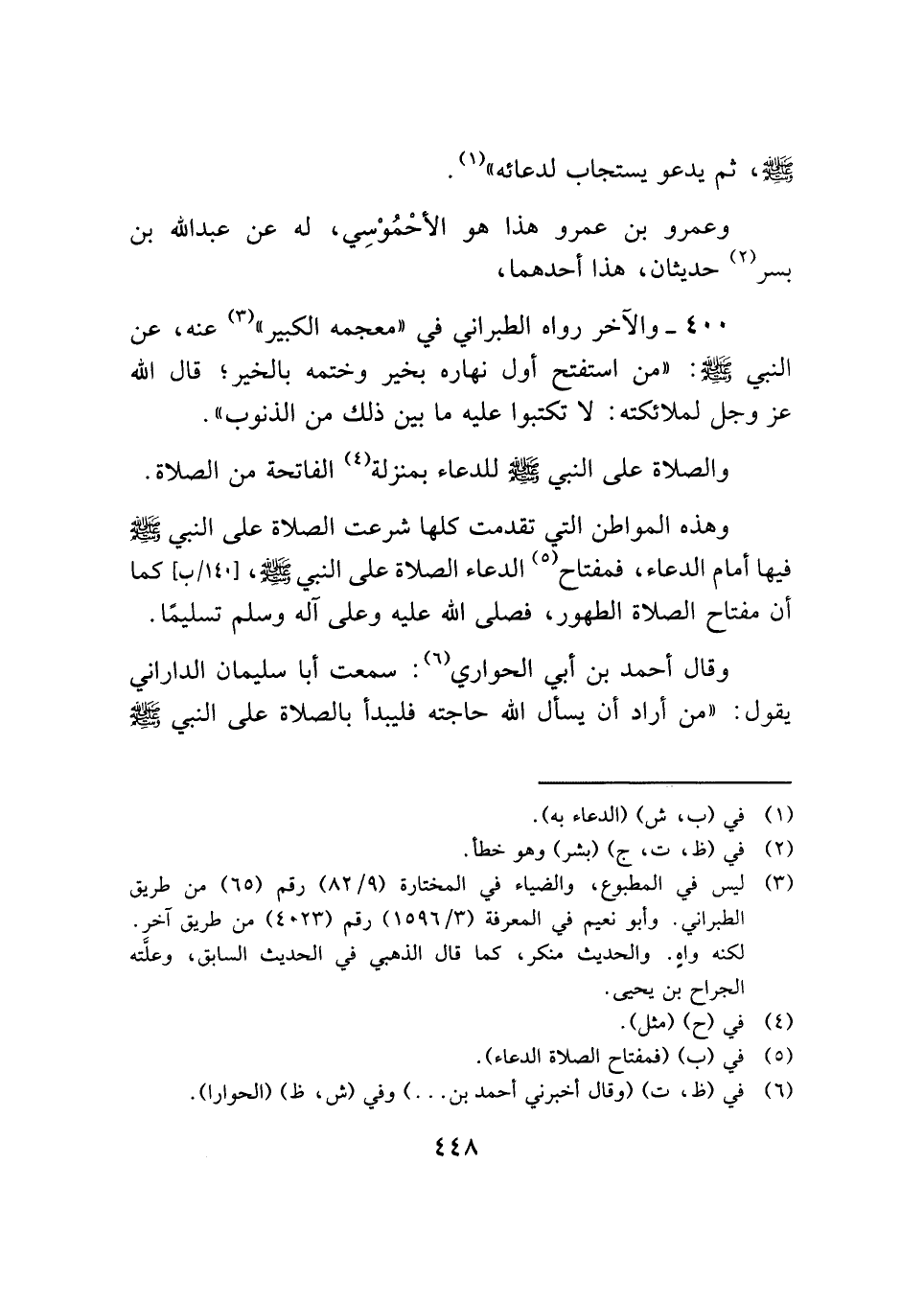 وقال أحمد بن أبي الحواري (¬٦): سمعت أبا سليمان الداراني يقول: "من أراد أن يسأل الله حاجته فليبدأ بالصلاة على النبي - صلى الله عليه وسلم -