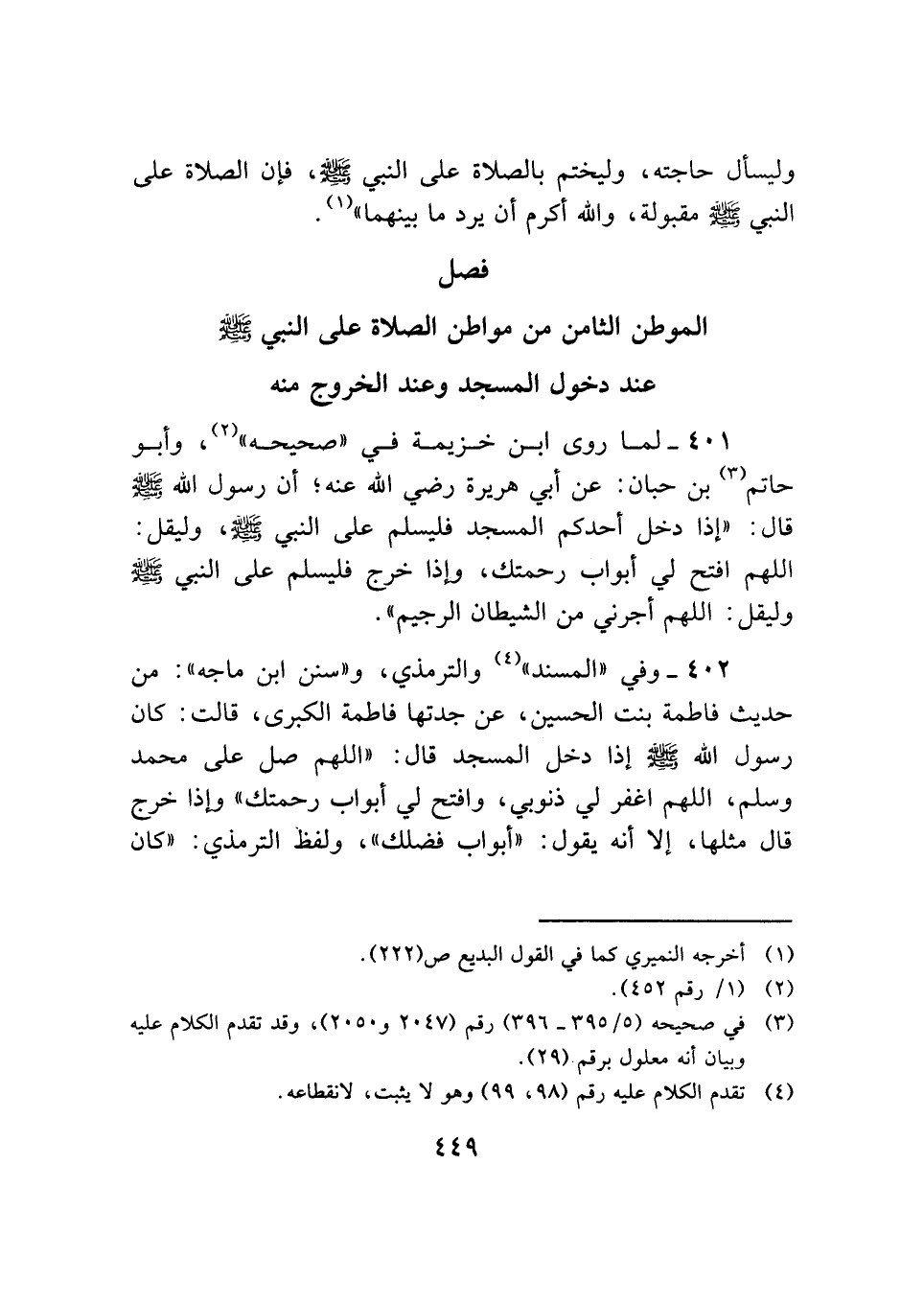 ٤٠١ - لما روى ابن خزيمة في "صحيحه" (¬٢)، وأبو حاتم (¬٣) بن حبان: عن أبي هريرة رضي الله عنه؛ أن رسول الله - صلى الله عليه وسلم - قال: "إذا دخل أحدكم المسجد فليسلم على النبي - صلى الله عليه وسلم -، وليقل: اللهم افتح لي أبواب رحمتك، وإذا خرج فليسلم على النبي - صلى الله عليه وسلم - وليقل: اللهم أجرني من الشيطان الرجيم".