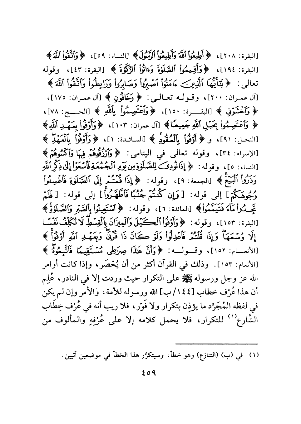 [البقرة: ٢٠٨]، {أَطِيعُوا اللَّهَ وَأَطِيعُوا الرَّسُولَ} [النساء: ٥٩]، {وَاتَّقُوا اللَّهَ} [البقرة: ١٩٤]، {وَأَقِيمُوا الصَّلَاةَ وَآتُوا الزَّكَاةَ} [البقرة: ٤٣]، وقوله تعالى: {يَاأَيُّهَا الَّذِينَ آمَنُوا اصْبِرُوا وَصَابِرُوا وَرَابِطُوا وَاتَّقُوا اللَّهَ} [آل عمران: ٢٠٠]، وقوله تعالى: {وَخَافُونِ} [آل عمران: ١٧٥]، {وَاخْشَوْنِي} [البقرة: ١٥٠]، {وَاعْتَصِمُوا بِاللَّهِ} [الحج: ٧٨] , {وَاعْتَصِمُوا بِحَبْلِ اللَّهِ جَمِيعًا} [آل عمران: ١٠٣]، {وَأَوْفُوا بِعَهْدِ اللَّهِ} [النحل: ٩١]، {أَوْفُوا بِالْعُقُودِ} [المائدة: ١]، {وَأَوْفُوا بِالْعَهْدِ} [الإسراء: ٣٤]، وقوله تعالى في اليتامى: {وَارْزُقُوهُمْ فِيهَا وَاكْسُوهُمْ} [النساء: ٥]، وقوله: {إِذَا نُودِيَ لِلصَّلَاةِ مِنْ يَوْمِ الْجُمُعَةِ فَاسْعَوْا إِلَى ذِكْرِ اللَّهِ وَذَرُوا الْبَيْعَ} [الجمعة: ٩]، وقوله: {إِذَا قُمْتُمْ إِلَى الصَّلَاةِ فَاغْسِلُوا وُجُوهَكُمْ} إلى قوله: {وَإِنْ كُنْتُمْ جُنُبًا فَاطَّهَّرُوا} إلى قوله: {فَلَمْ تَجِدُوا مَاءً فَتَيَمَّمُوا} [المائدة: ٦]، وقوله: {اسْتَعِينُوا بِالصَّبْرِ وَالصَّلَاةِ} [البقرة: ١٥٣]، وقوله: {وَأَوْفُوا الْكَيْلَ وَالْمِيزَانَ بِالْقِسْطِ لَا نُكَلِّفُ نَفْسًا إِلَّا وُسْعَهَا وَإِذَا قُلْتُمْ فَاعْدِلُوا وَلَوْ كَانَ ذَا قُرْبَى وَبِعَهْدِ اللَّهِ أَوْفُوا} [الأنعام: ١٥٢]، وقوله: {وَأَنَّ هَذَا صِرَاطِي مُسْتَقِيمًا فَاتَّبِعُوهُ} [الأنعام: ١٥٣]. وذلك في القرآن أكثر من أن يُحْصَر، وإذا كانت أوامر الله عز وجل ورسوله - صلى الله عليه وسلم - على التكرار حيث وردت إلا في النادر، عُلِم أن هذا عُرْف خطاب الله ورسوله للأمة، والأمر وإن لم يكن في لفظه المُجَرَّد ما يؤذِن بتكرار ولا فوْر، فلا ريب أنه في عُرْف خِطَاب الشَّارع (¬١) للتكرار، فلا يحمل كلامه إلا على عُرْفِهِ والمألوف من