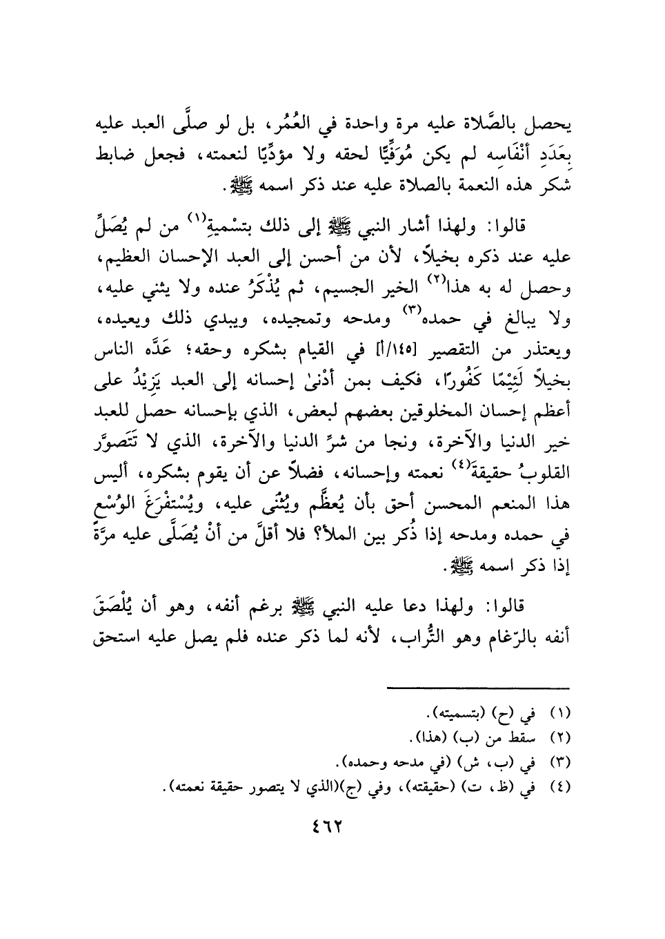 قالوا: ولهذا أشار النبي - صلى الله عليه وسلم - إلى ذلك بتسْميةِ (¬١) من لم يُصَلِّ عليه عند ذكره بخيلًا، لأن من أحسن إلى العبد الإحسان العظيم، وحصل له به هذا (¬٢) الخير الجسيم، ثم يُذكَرُ عنده ولا يثني عليه، ولا يبالغ في حمده (¬٣) ومدحه وتمجيده، ويبدي ذلك ويعيده، ويعتذر من التقصير في القيام بشكره وحقه؛ عَدَّه الناس بخيلًا لَئِيْمًا كَفُورًا، فكيف بمن أدْنى إحسانه إلى العبد يَزِيْدُ على أعظم إحسان المخلوقين بعضهم لبعض، الذي بإحسانه حصل للعبد خير الدنيا والآخرة، ونجا من شرِّ الدنيا والآخرة، الذي لا تَتَصوَّر القلوبُ حقيقةَ (¬٤) نعمته وإحسانه، فضلًا عن أن يقوم بشكره، أليس هذا المنعم المحسن أحق بأن يُعظَّم ويُثْنَى عليه، ويُسْتفْرَغَ الوُسْع في حمده ومدحه إذا ذُكر بين الملأ؟ فلا أقلَّ من أنْ يُصَلَّى عليه مرَّةً إذا ذكر اسمه - صلى الله عليه وسلم -.