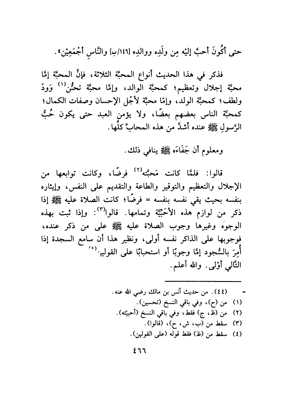 فذكر في هذا الحديث أنواع المحبَّة الثلاثة، فإنَّ المحبَّة إمَّا محبَّة إجلال وتعظيم؛ كمحبَّه الوالد، وإمَّا محبَّة تحنُّن (¬١) وَودّ ولطف؛ كمحبَّة الولد، وإمّا محبَّة لأجْل الإحسان وصفات الكمال؛ كمحبَّة الناس بعضهم بعضًا، ولا يؤمن العبد حتى يكون حُبُّ الرَّسولِ - صلى الله عليه وسلم - عنده أشدَّ من هذه المحابِّ كلِّها.