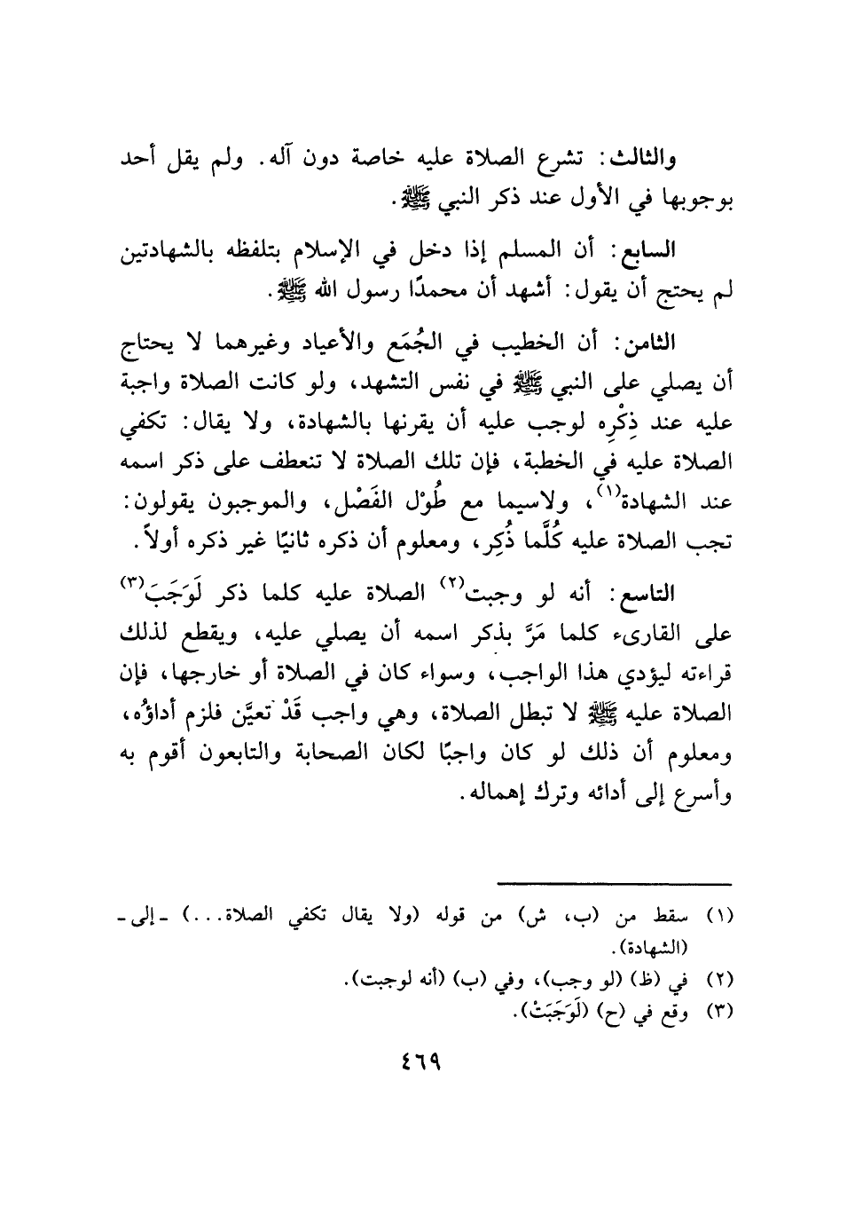 (¬١) سقط من (ب، ش) من قوله (ولا يقال تكفي الصلاة ... ) -إلى- (الشهادة).