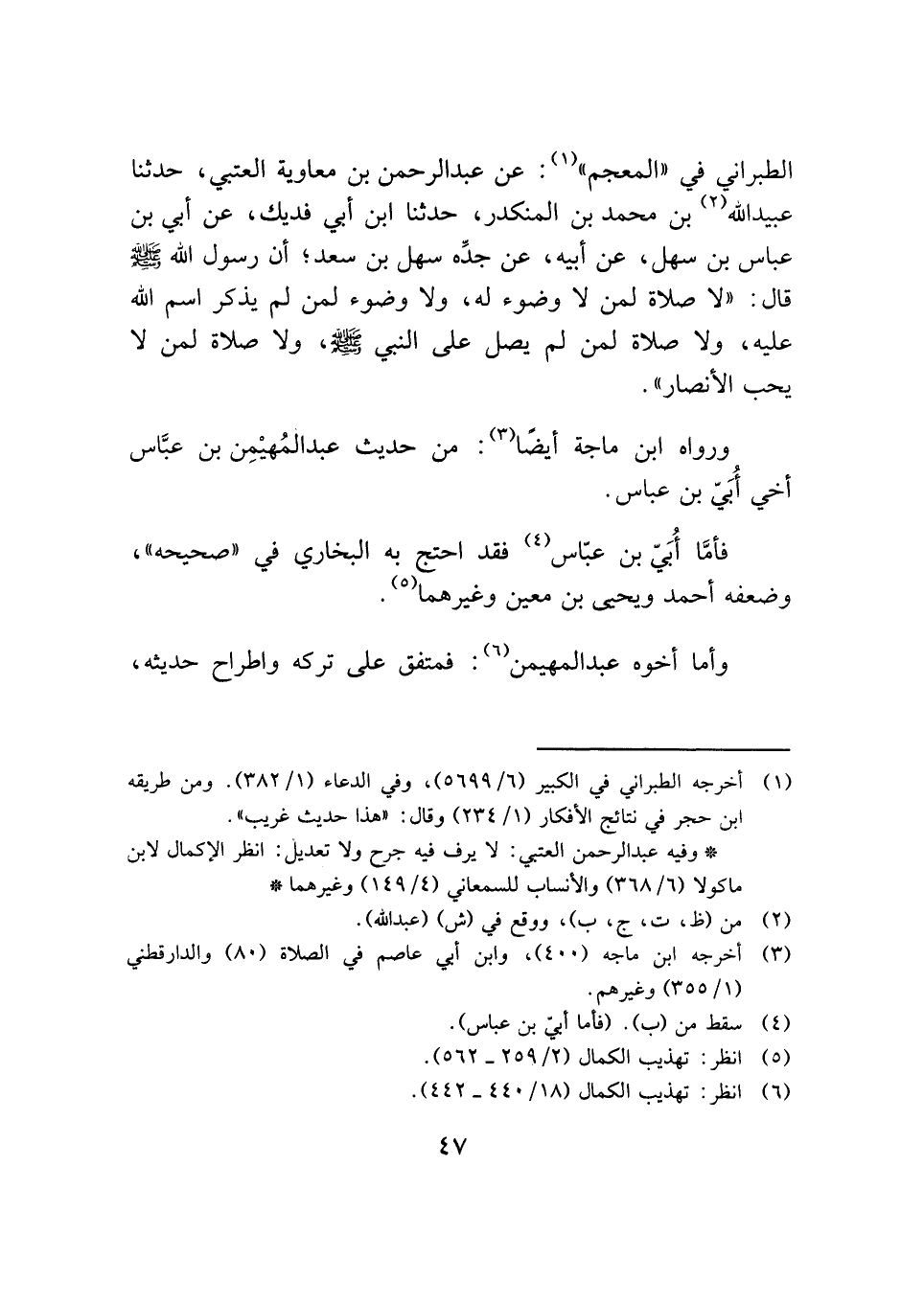 فأمَّا أُبَيّ بن عبّاس (¬٤) فقد احتج به البخاري في "صحيحه"، وضعفه أحمد ويحيى بن معين وغيرهما (¬٥).