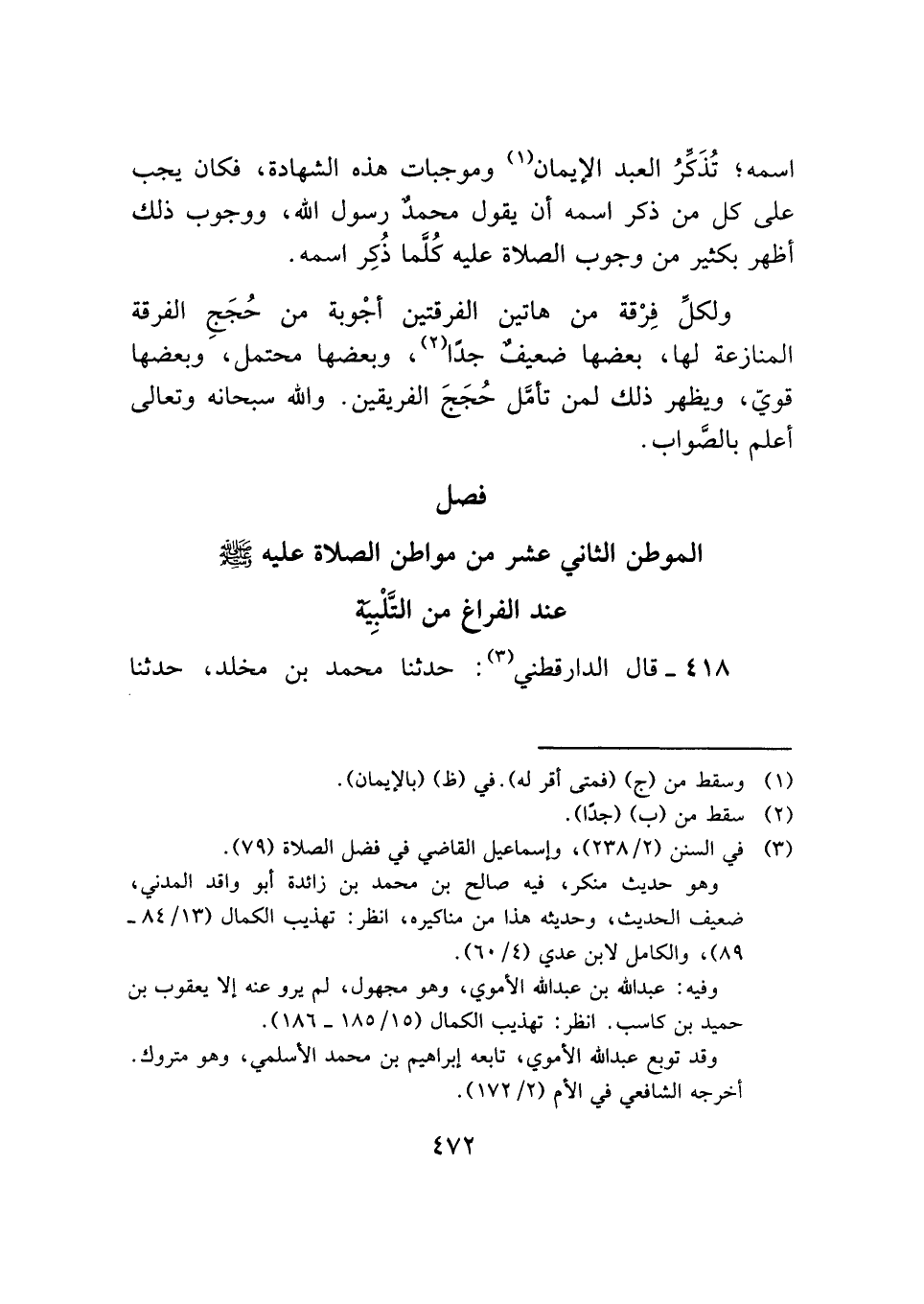 فصل الموطن الثاني عشر من مواطن الصلاة عليه - صلى الله عليه وسلم - عند الفراغ من التَّلْبِيَة