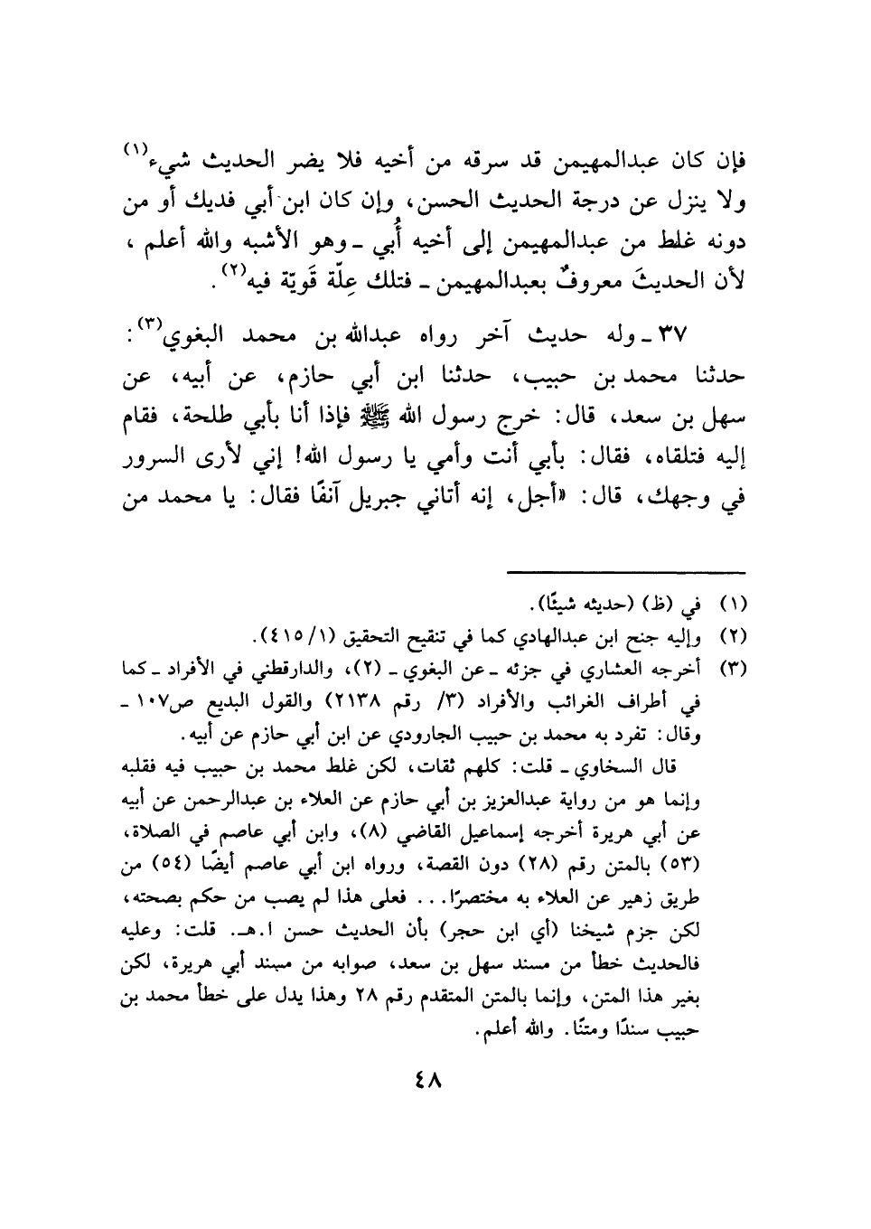 فإن كان عبد المهيمن قد سرقه من أخيه فلا يضر الحديث شيء (¬١) ولا ينزل عن درجة الحديث الحسن، وإن كان ابن أبي فديك أو من دونه غلط من عبد المهيمن إلى أخيه أُبي -وهو الأشبه والله أعلم، لأن الحديثَ معروفٌ بعبد المهيمن- فتلك عِلّة قَويّة فيه (¬٢).