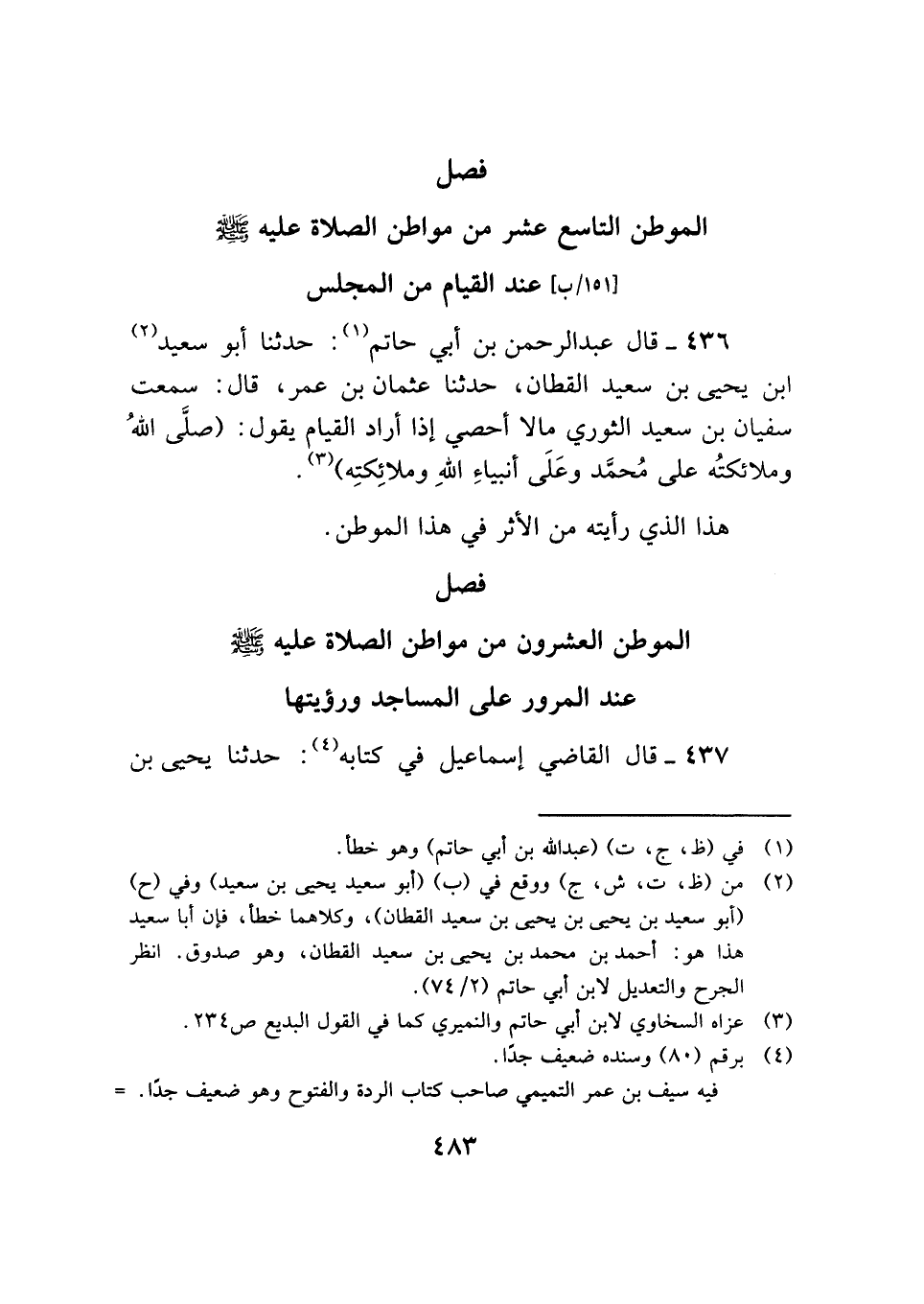 ٤٣٦ - قال عبد الرحمن بن أبي حاتم (¬١): حدثنا أبو سعيد (¬٢) يحيى بن سعيد القطان، حدثنا عثمان بن عمر، قال: سمعت سفيان بن سعيد الثوري مالا أحصي إذا أراد القيام يقول: (صلَّى اللهُ وملائكتُه على مُحمَّد وعَلَى أنبياءِ اللهِ وملائِكتِه) (¬٣).