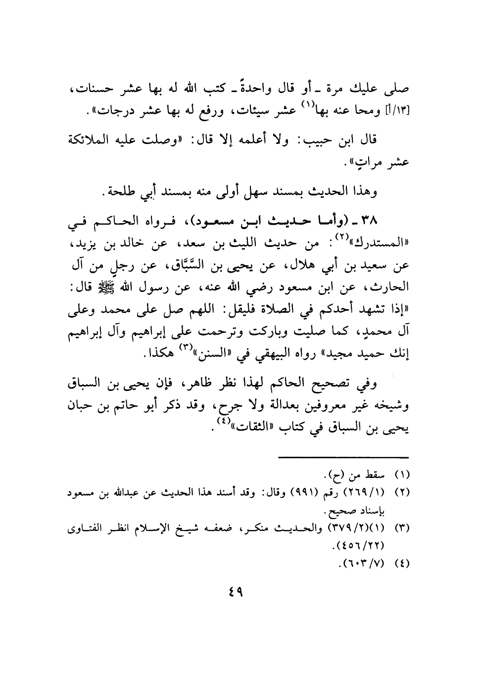 ٣٨ - (وأما حديث ابن مسعود)، فرواه الحاكم في "المستدرك" (¬٢): من حديث الليث بن سعد، عن خالد بن يزيد، عن سعيد بن أبي هلال، عن يحيى بن السَّبَّاق، عن رجلٍ من آل الحارث، عن ابن مسعود رضي الله عنه، عن رسول الله -صلى الله عليه وسلم- قال: "إذا تشهد أحدكم في الصلاة فليقل: اللهم صل على محمد وعلى آل محمدٍ، كما صليت وباركت وترحمت على إبراهيم وآل إبراهيم إنك حميد مجيد" رواه البيهقي في "السنن" (¬٣) هكذا.