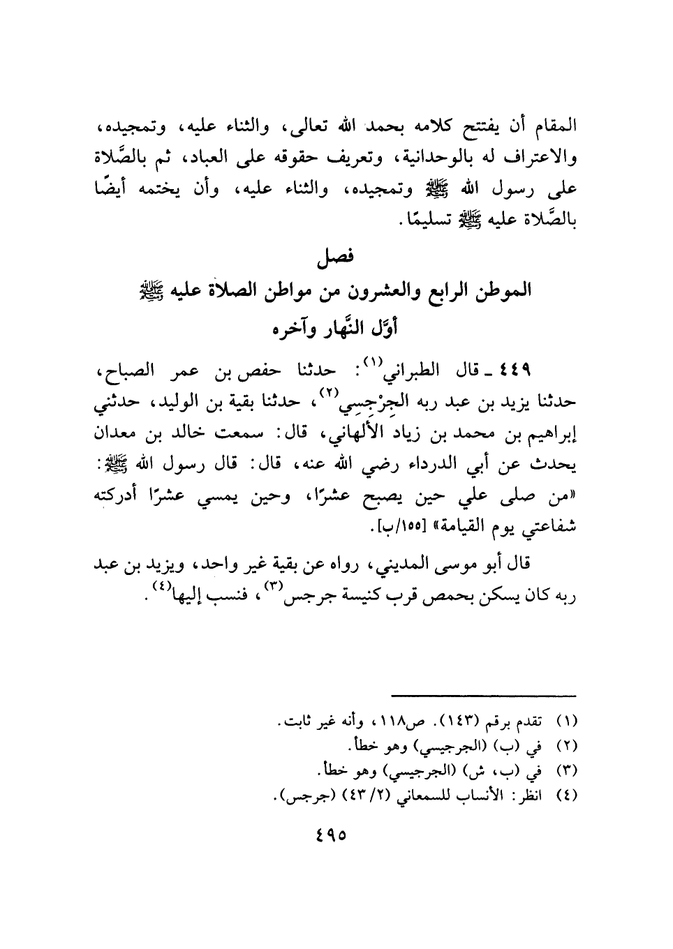 ٤٤٩ - قال الطبراني (¬١): حدثنا حفص بن عمر الصباح، حدثنا يزيد بن عبد ربه الجرْجسِي (¬٢)، حدثنا بقية بن الوليد، حدثني إبراهيم بن محمد بن زيادَ الأَلهاني، قال: سمعت خالد بن معدان يحدث عن أبي الدرداء رضي الله عنه، قال: قال رسول الله - صلى الله عليه وسلم -: "من صلى علي حين يصبح عشرًا، وحين يمسي عشرًا أدركته شفاعتي يوم القيامة".