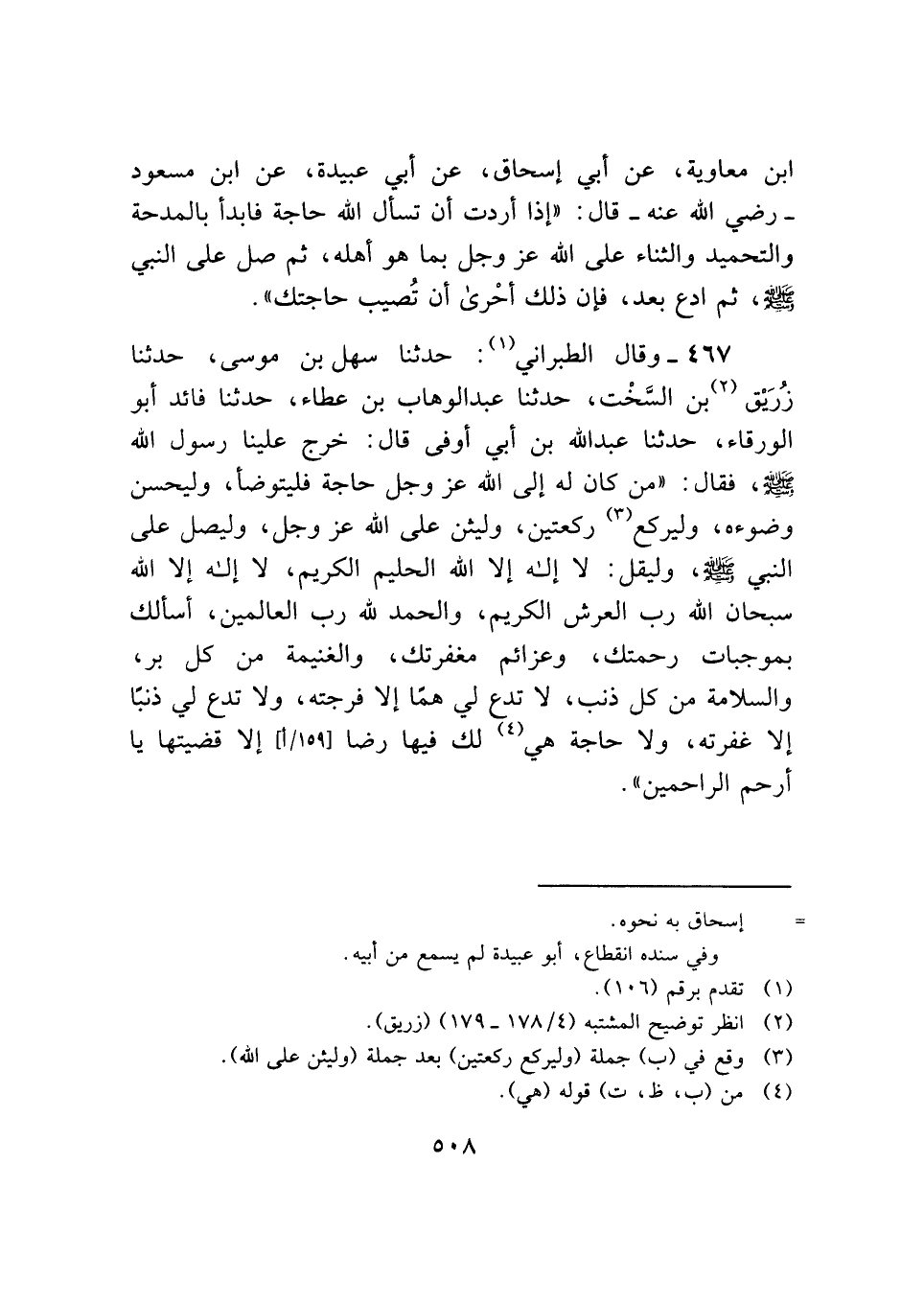 ٤٦٧ - وقال الطبراني (¬١): حدثنا سهل بن موسى، حدثنا زُرَيْق (¬٢) بن السَّخْت، حدثنا عبد الوهاب بن عطاء، حدثنا فائد أبو الورقاء، حدثنا عبد الله بن أبي أوفى قال: خرج علينا رسول الله - صلى الله عليه وسلم -، فقال: "من كان له إلى الله عز وجل حاجة فليتوضأ، وليحسن وضوءه، وليركع (¬٣) ركعتين، وليثن على الله عز وجل، وليصل على النبي - صلى الله عليه وسلم -، وليقل: لا إله إلا الله الحليم الكريم، لا إله إلا الله سبحان الله رب العرش الكريم، والحمد لله رب العالمين، أسألك بموجبات رحمتك، وعزائم مغفرتك، والغنيمة من كل بر، والسلامة من كل ذنب، لا تدع لي همًا إلا فرجته، ولا تدع لي ذنبًا إلا غفرته، ولا حاجة هي (¬٤) لك فيها رضا إلا قضيتها يا أرحم الراحمين".