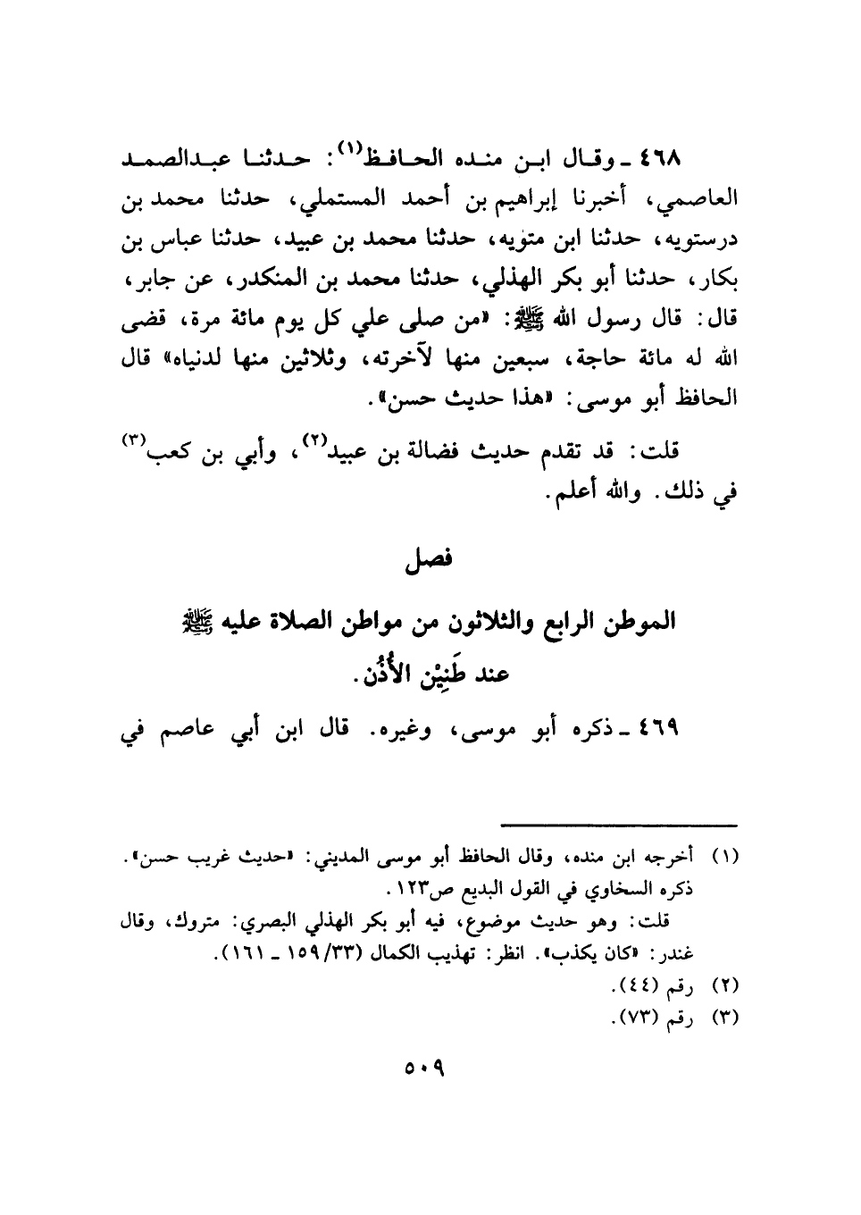 ٤٦٨ - وقال ابن منده الحافظ (¬١): حدثنا عبد الصمد العاصمي، أخبرنا إبراهيم بن أحمد المستملي، حدثنا محمد بن درستويه، حدثنا ابن متويه، حدثنا محمد بن عبيد، حدثنا عباس بن بكار، حدثنا أبو بكر الهذلي، حدثنا محمد بن المنكدر، عن جابر، قال: قال رسول الله - صلى الله عليه وسلم -: "من صلى علي كل يوم مائة مرة، قضى الله له مائة حاجة، سبعين منها لآخرته، وثلاثين منها لدنياه" قال الحافظ أبو موسى: "هذا حديث حسن".