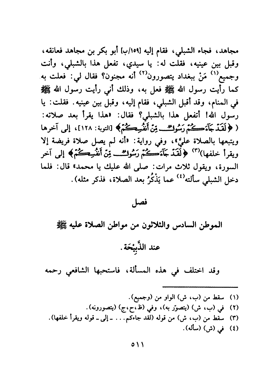 مجاهد، فجاء الشبلي، فقام إليه أبو بكر بن مجاهد فعانقه، وقبل بين عينيه، فقلت له: يا سيدي، تفعل هذا بالشبلي، وأنت وجميع (¬١) مَنْ ببغداد يتصورون (¬٢) أنه مجنون؟ فقال لي: فعلت به كما رأيت رسول الله - صلى الله عليه وسلم - فعل به، وذلك أني رأيت رسول الله - صلى الله عليه وسلم - في المنام، وقد أقبل الشبلي، فقام إليه، وقبل بين عينيه. فقلت: يا رسول الله! أتفعل هذا بالشبلي؟ فقال: "هذا يقرأ بعد صلاته: ({لَقَدْ جَاءَكُمْ رَسُولٌ مِنْ أَنْفُسِكُمْ} [التوبة: ١٢٨]، إلى آخرها ويتبعها بالصلاة عليَّ"، وفي رواية: "أنه لم يصل صلاة فريضة إلا ويقرأ خلفها) (¬٣) {لَقَدْ جَاءَكُمْ رَسُولٌ مِنْ أَنْفُسِكُمْ} إلى آخر السورة، ويقول ثلاث مرات: صلى الله عليك يا محمد" قال: فلما دخل الشبلي سألته (¬٤) عما يَذْكُرُ بعد الصلاة، فذكر مثله).