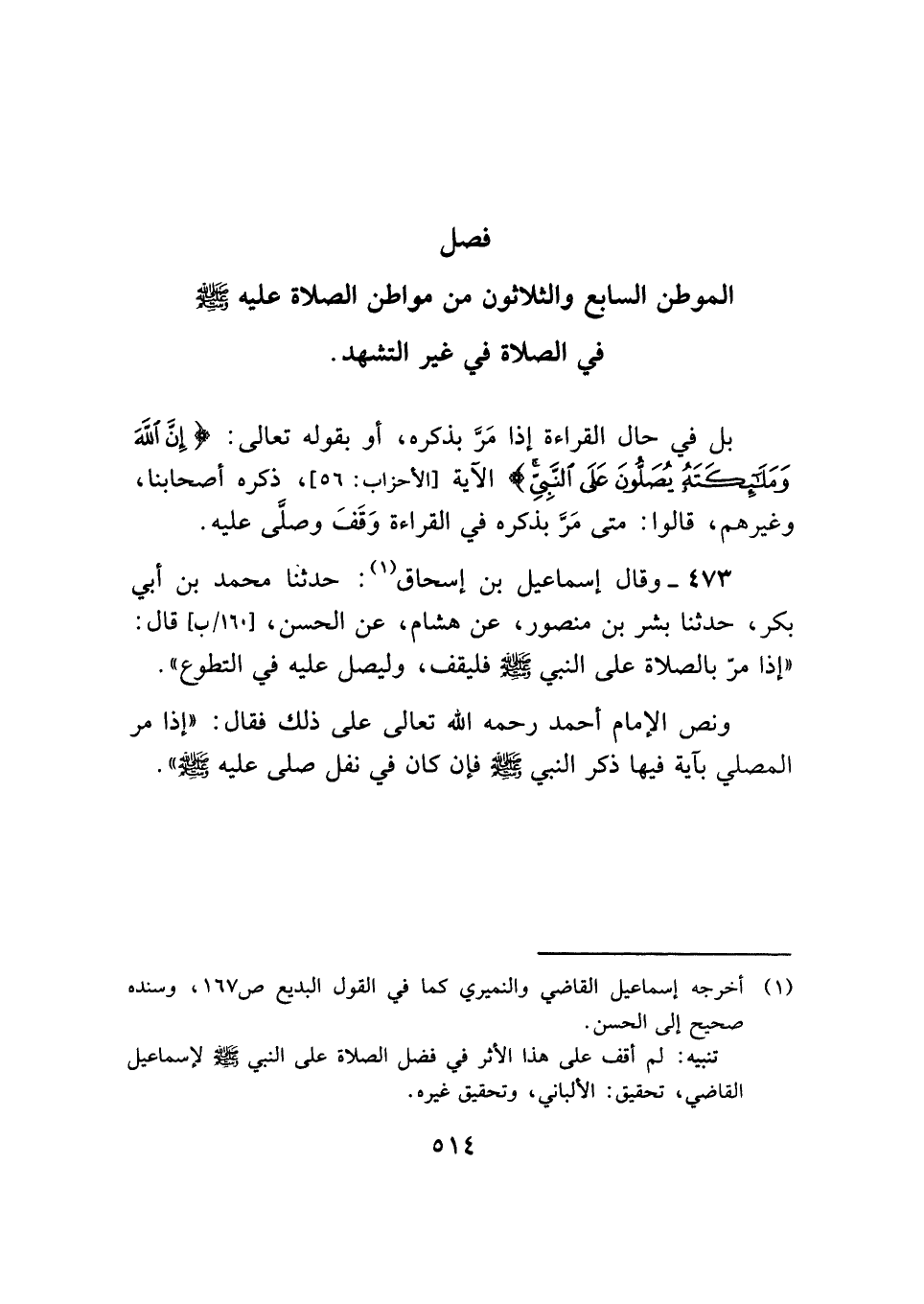 ٤٧٣ - وقال إسماعيل بن إسحاق (¬١): حدثنا محمد بن أبي بكر، حدثنا بشر بن منصور، عن هشام، عن الحسن، قال: "إذا مرّ بالصلاة على النبي - صلى الله عليه وسلم - فليقف، وليصل عليه في التطوع".