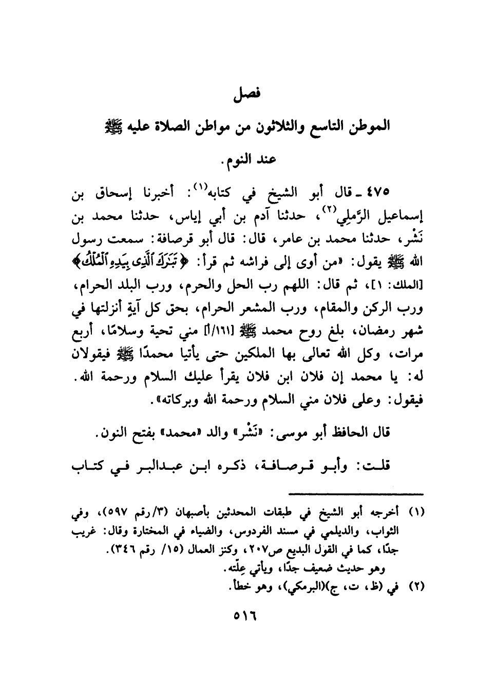 ٤٧٥ - قال أبو الشيخ في كتابه (¬١): أخبرنا إسحاق بن إسماعيل الرَّملِي (¬٢)، حدثنا آدم بن أبي إياس، حدثنا محمد بن نَشْر، حدثنا محمد بن عامر، قال: قال أبو قرصافة: سمعت رسول الله - صلى الله عليه وسلم - يقول: "من أوى إلى فراشه ثم قرأ: {تَبَارَكَ الَّذِي بِيَدِهِ الْمُلْكُ} [الملك: ١]، ثم قال: اللهم رب الحل والحرم، ورب البلد الحرام، ورب الركن والمقام، ورب المشعر الحرام، بحق كل آيةٍ أنزلتها في شهر رمضان، بلغ روح محمد - صلى الله عليه وسلم - مني تحية وسلامًا، أربع مرات، وكل الله تعالى بها الملكين حتى يأتيا محمدًا - صلى الله عليه وسلم - فيقولان له: يا محمد إن فلان ابن فلان يقرأ عليك السلام ورحمة الله. فيقول: وعلى فلان مني السلام ورحمة الله وبركاته".