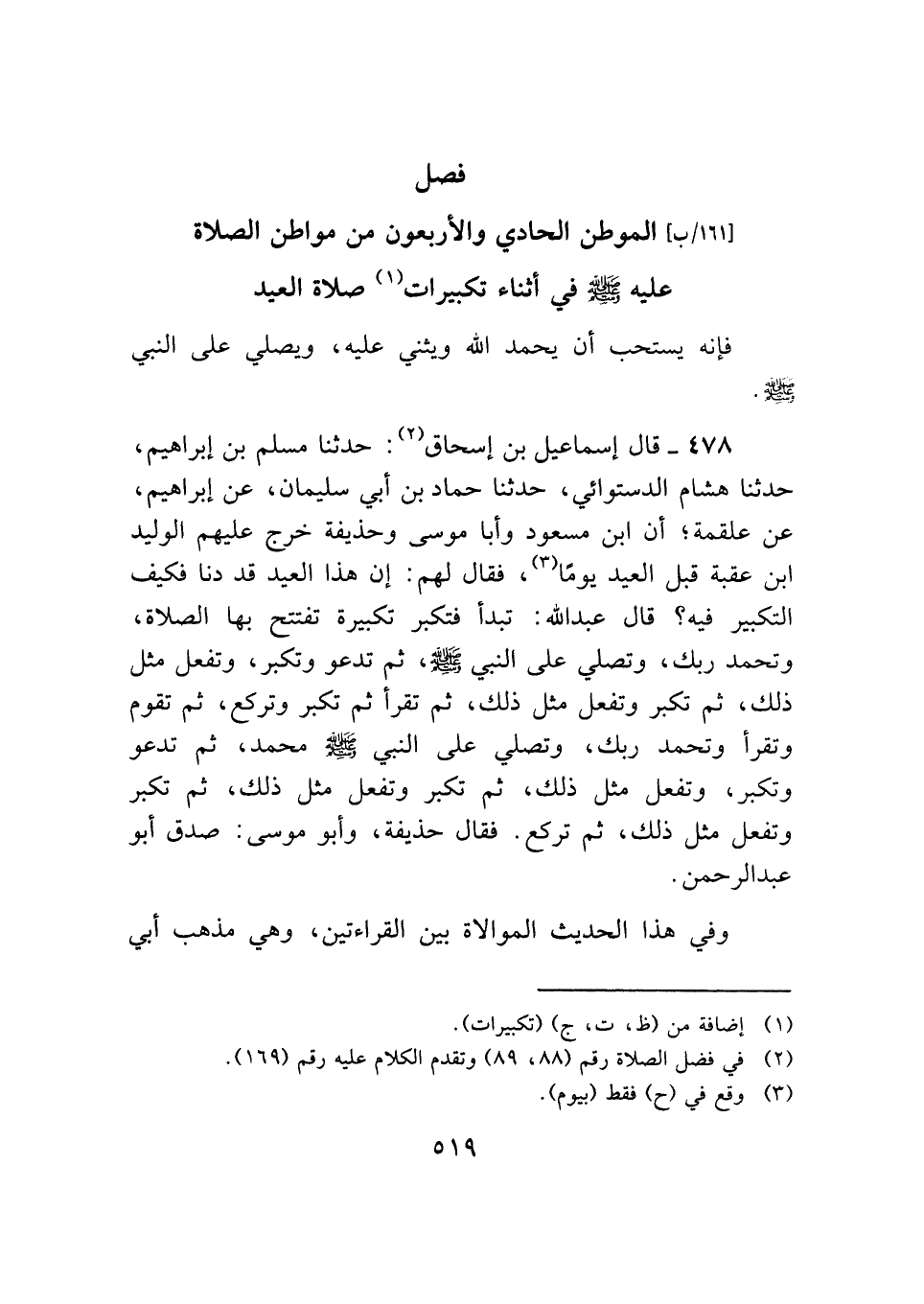 ٤٧٨ - قال إسماعيل بن إسحاق (¬٢): حدثنا مسلم بن إبراهيم، حدثنا هشام الدستوائي، حدثنا حماد بن أبي سليمان، عن إبراهيم، عن علقمة؛ أن ابن مسعود وأبا موسى وحذيفة خرج عليهم الوليد بن عقبة قبل العيد يومًا (¬٣)، فقال لهم: إن هذا العيد قد دنا فكيف التكبير فيه؟ قال عبد الله: تبدأ فتكبر تكبيرة تفتتح بها الصلاة، وتحمد ربك، وتصلي على النبي - صلى الله عليه وسلم -، ثم تدعو وتكبر، وتفعل مثل ذلك، ثم تكبر وتفعل مثل ذلك، ثم تقرأ ثم تكبر وتركع، ثم تقوم وتقرأ وتحمد ربك، وتصلي على النبي - صلى الله عليه وسلم - محمد، ثم تدعو وتكبر، وتفعل مثل ذلك، ثم تكبر وتفعل مثل ذلك، ثم تكبر وتفعل مثل ذلك، ثم تركع. فقال حذيفة، وأبو موسى: صدق أبو عبد الرحمن.