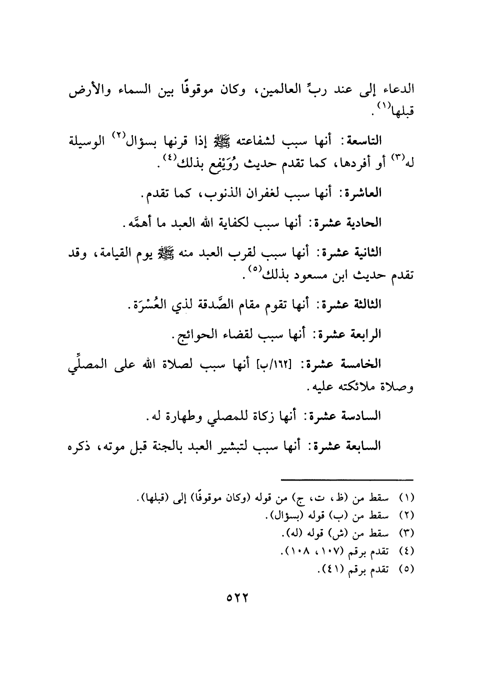 الثانية عشرة: أنها سبب لقرب العبد منه - صلى الله عليه وسلم - يوم القيامة، وقد تقدم حديث ابن مسعود بذلك (¬٥).