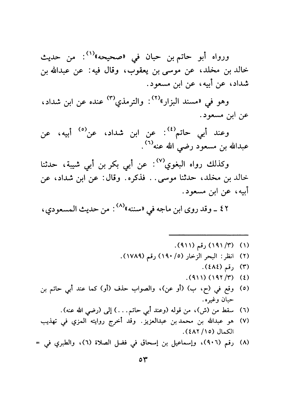 ورواه أبو حاتم بن حبان في "صحيحه" (¬١): من حديث خالد بن مخلد، عن موسى بن يعقوب، وقال فيه: عن عبد الله بن شداد، عن أبيه، عن ابن مسعود.