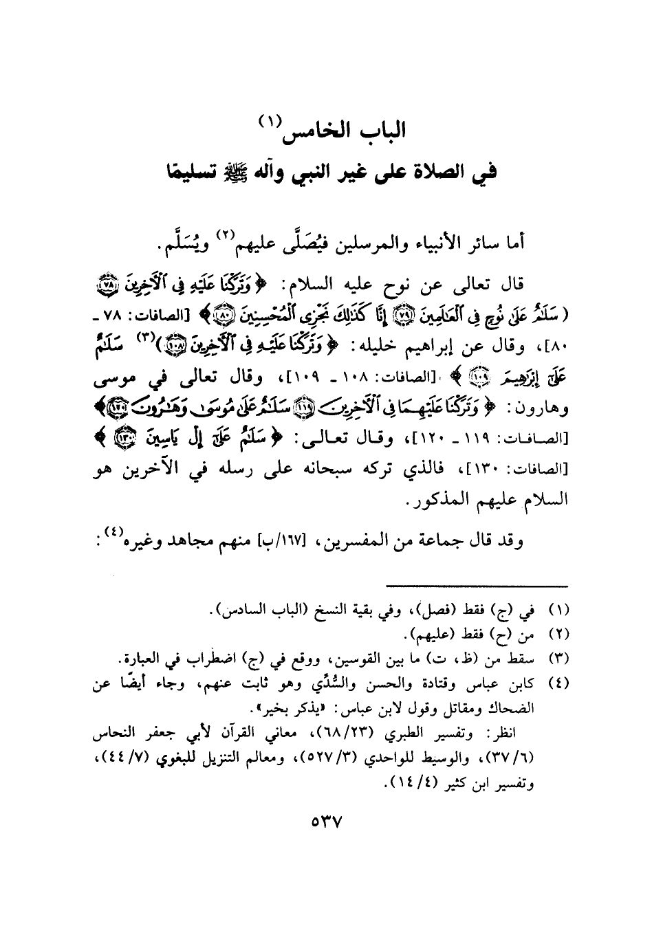قال تعالى عن نوح عليه السلام: {وَتَرَكْنَا عَلَيْهِ فِي الْآخِرِينَ (٧٨) سَلَامٌ عَلَى نُوحٍ فِي الْعَالَمِينَ (٧٩) إِنَّا كَذَلِكَ نَجْزِي الْمُحْسِنِينَ} [الصافات: ٧٨ - ٨٠]، وقال عن إبراهيم خليله: {وَتَرَكْنَا عَلَيْهِ فِي الْآخِرِينَ (١٠٨) (¬٣) سَلَامٌ عَلَى إِبْرَاهِيمَ (١٠٩)} [الصافات: ١٠٨ - ١٠٩]، وقال تعالى في موسى وهارون: {وَتَرَكْنَا عَلَيْهِمَا فِي الْآخِرِينَ (١١٩) سَلَامٌ عَلَى مُوسَى وَهَارُونَ (١٢٠)} [الصافات: ١١٩ - ١٢٠]، وقال تعالى: {سَلَامٌ عَلَى إِلْ يَاسِينَ (١٣٠)} [الصافات: ١٣٠]، فالذي تركه سبحانه على رسله في الآخرين هو السلام عليهم المذكور.