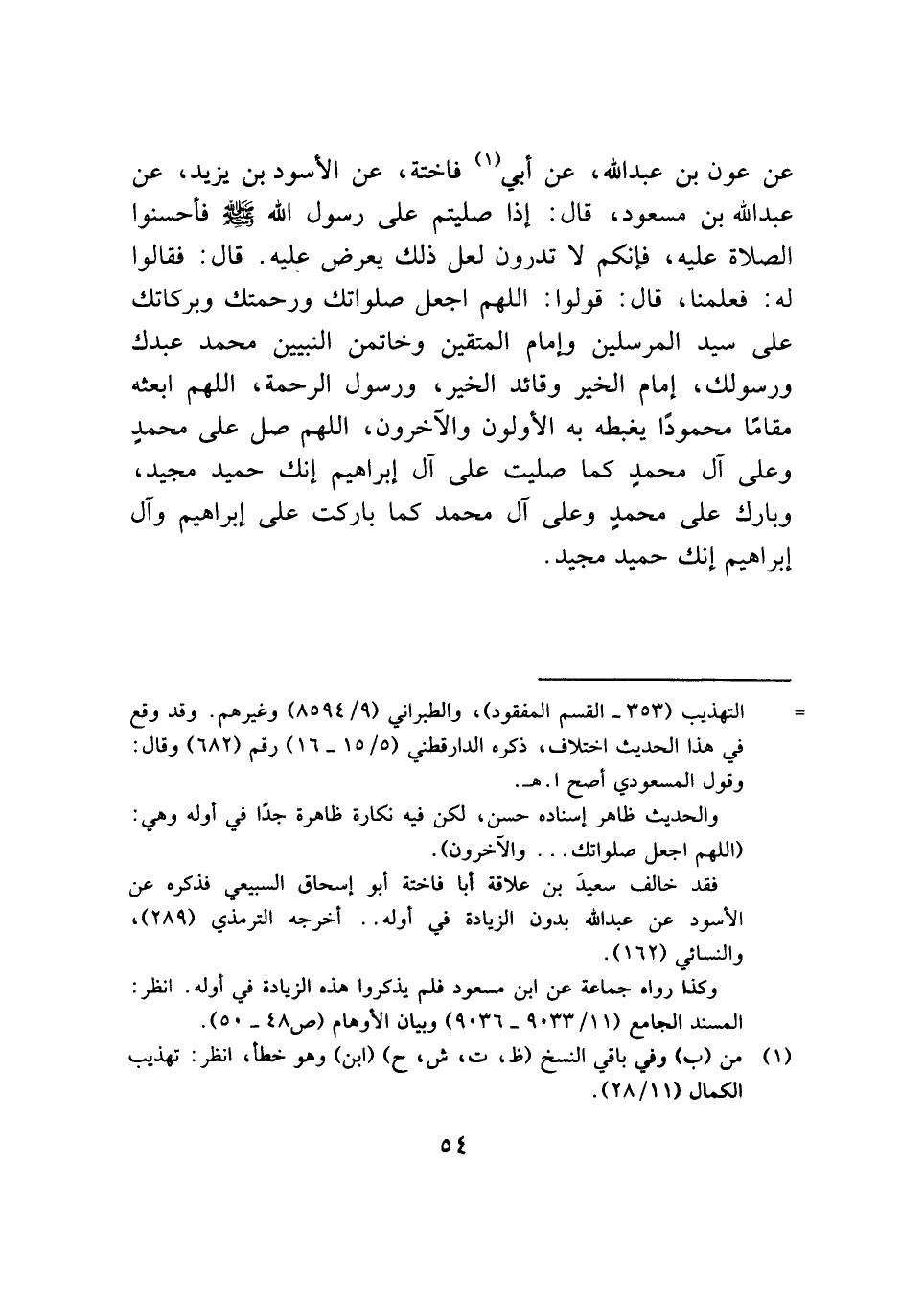 عن عون بن عبد الله، عن أبي (¬١) فاختة، عن الأسود بن يزيد، عن عبد الله بن مسعود، قال: إذا صليتم على رسول الله -صلى الله عليه وسلم- فأحسنوا الصلاة عليه، فإنكم لا تدرون لعل ذلك يعرض عليه. قال: فقالوا له: فعلمنا، قال: قولوا: اللهم اجعل صلواتك ورحمتك وبركاتك على سيد المرسلين وإمام المتقين وخاتمن النبيين محمد عبدك ورسولك، إمام الخير وقائد الخير، ورسول الرحمة، اللهم ابعثه مقامًا محمودًا يغبطه به الأولون والآخرون، اللهم صل على محمدٍ وعلى آل محمدٍ كما صليت على آل إبراهيم إنك حميد مجيد، وبارك على محمدٍ وعلى آل محمد كما باركت على إبراهيم وآل إبراهيم إنك حميد مجيد.