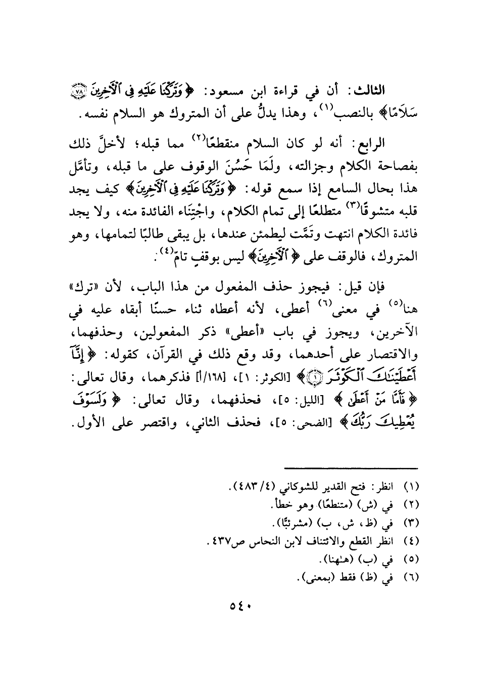 الثالث: أن في قراءة ابن مسعود: {وَتَرَكْنَا عَلَيْهِ فِي الْآخِرِينَ (٧٨) سَلَامًا} بالنصب (¬١)، وهذا يدلُّ على أن المتروك هو السلام نفسه.