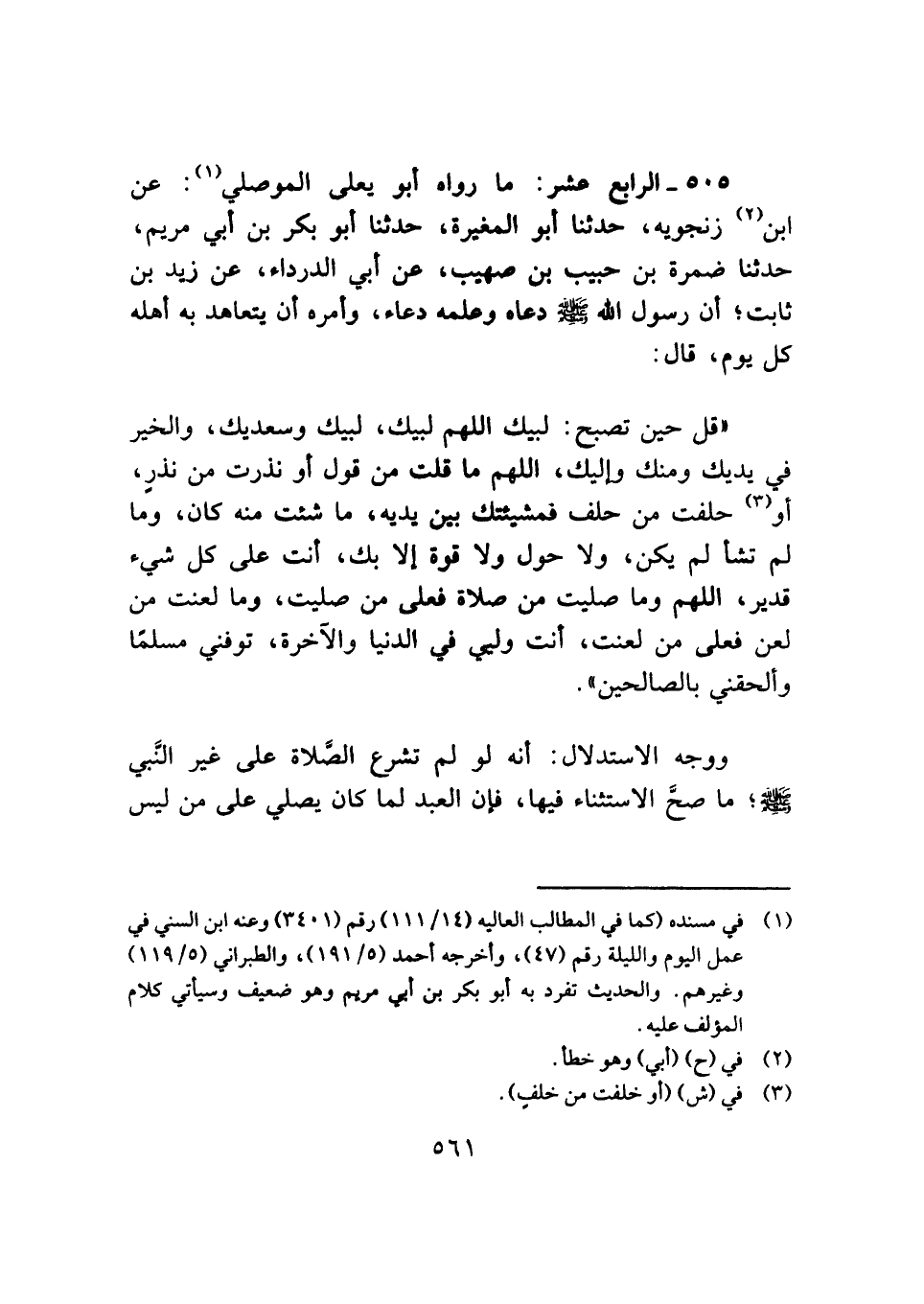 "قل حين تصبح: لبيك اللهم لبيك، لبيك وسعديك، والخير في يديك ومنك وإليك، اللهم ما قلت من قول أو نذرت من نذرٍ، أو (¬٣) حلفت من حلف فمشيئتك بين يديه، ما شئت منه كان، وما لم تشأ لم يكن، ولا حول ولا قوة إلا بك، أنت على كل شيء قدير، اللهم وما صليت من صلاة فعلى من صليت، وما لعنت من لعن فعلى من لعنت، أنت وليي في الدنيا والآخرة، توفني مسلمًا وألحقني بالصالحين".